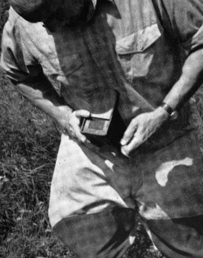 In order to time a bee it is necessary to be able to identify an individual. George Smith used to do this by extracting some seed or pollen from the bud of a small mossy plant and sprinkling a little of the green dust on the back of a bee. At best it was an uncertain process as the dust was liable to be blown off before the bee’s return, and even if not, was hard to see. I have evolved a simpler and better system. To our equipment as already described, let us add a small bottle of water, a tiny camel’s hair brush, and a piece of blue carpenter’s chalk. With the blade of a penknife, scrape some dust from the chalk onto the back of a smooth stone or the blade of a hand axe if you carry one. Incidentally a small scout’s axe is a handy thing to have for clearing[21] brush, making stands, marking the bee tree when you have found it, and blazing a trail from it if it is deep in the woods and should be hard to find again. On the chalk dust, with the brush, drop a few drops of water and stir till the water is coloured blue. Then with the wet brush dab the rear of a loading bee. This must be done deftly and gently. Bees do not like to be painted. A good hunter can guess which bee is apt to be unreasonably phlegmatic and, especially if one is loading from a half empty cell, with the shoulders buried and his tail raised, he can be painted without disturbing him. Once daubed, the new decoration does not annoy him in the least and is not noticed by his fellows. When wet, the spot shows only slightly, but by the time the bee returns, the chalk dust will be dry and will stand out like a beacon so vivid that it can be spotted even before the bee alights. We now have an identifiable bee and can time him.