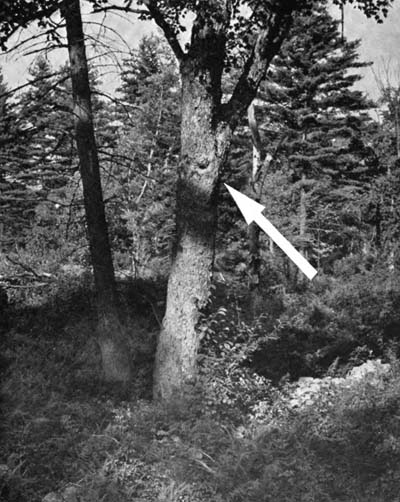 Of course, the greatest thrill of the hunt comes when one finds the tree. Sometimes it is abrupt, if the hole is in an unshaded limb or bole in plain view. More often it is in a position where one has to manoeuvre to see it, and the first warning comes when one sees the flash of wings in the air and, in an agony of hope and doubt, moves about until the hole can be seen and the presence of the swarm truly verified. Even when the tree is pinned between two stands, it may take a long time. I remember one tree that we had so pinned. I had with me my son, who is a good bee hunter, a companion of his, and a couple of rank amateurs. The five of us tramped the area between the two stands for an hour before I found the hive. It was in a smallish swamp maple that divided into two boles four feet above the ground. Neither hole was big enough to hold bees, so we had passed it unsuspecting. In the crotch where the boles divided was a hole and into this the bees were dropping, making their home in the short trunk near the ground. After we had found it we noted that we had actually trampled a path through the ferns within fifteen feet of the tree.