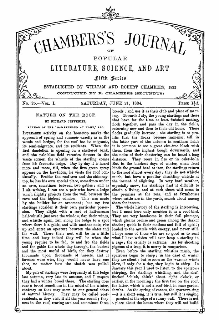 Increased activity on the housetop marks the approach of spring and summer exactly as in the woods and hedges, for the roof has its migrants, its semi-migrants, and its residents. When the first dandelion is opening on a sheltered bank, and the pale-blue field veronica flowers in the waste corner, the whistle of the starling comes from his favourite ledge. Day by day it is heard more and more, till, when the first green spray appears on the hawthorn, he visits the roof continually. Besides the roof-tree and the chimney-top, he has his own special place, sometimes under an eave, sometimes between two gables; and as I sit writing, I can see a pair who have a ledge which slightly projects from the wall between the eave and the highest window. This was made by the builder for an ornament; but my two starlings consider it their own particular possession. They alight with a sort of half-scream half-whistle just over the window, flap their wings, and whistle again, run along the ledge to a spot where there is a gable, and with another note, rise up and enter an aperture between the slates and the wall. There their nest will be in a little time, and busy indeed they will be when the young require to be fed, to and fro the fields and the gable the whole day through, the busiest and the most useful of birds, for they destroy thousands upon thousands of insects, and if farmers were wise, they would never have one shot, no matter how the thatch was pulled about.