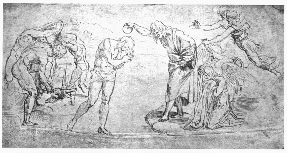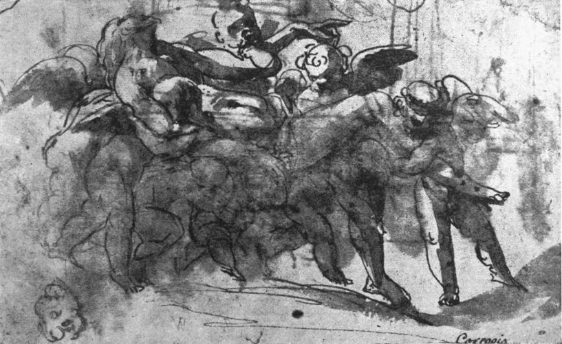 “THE DEAD CHRIST CARRIED OFF BY ANGELS.” DRAWING IN PEN AND INK BY CORREGGIO IN THE UFFIZI, FLORENCE.