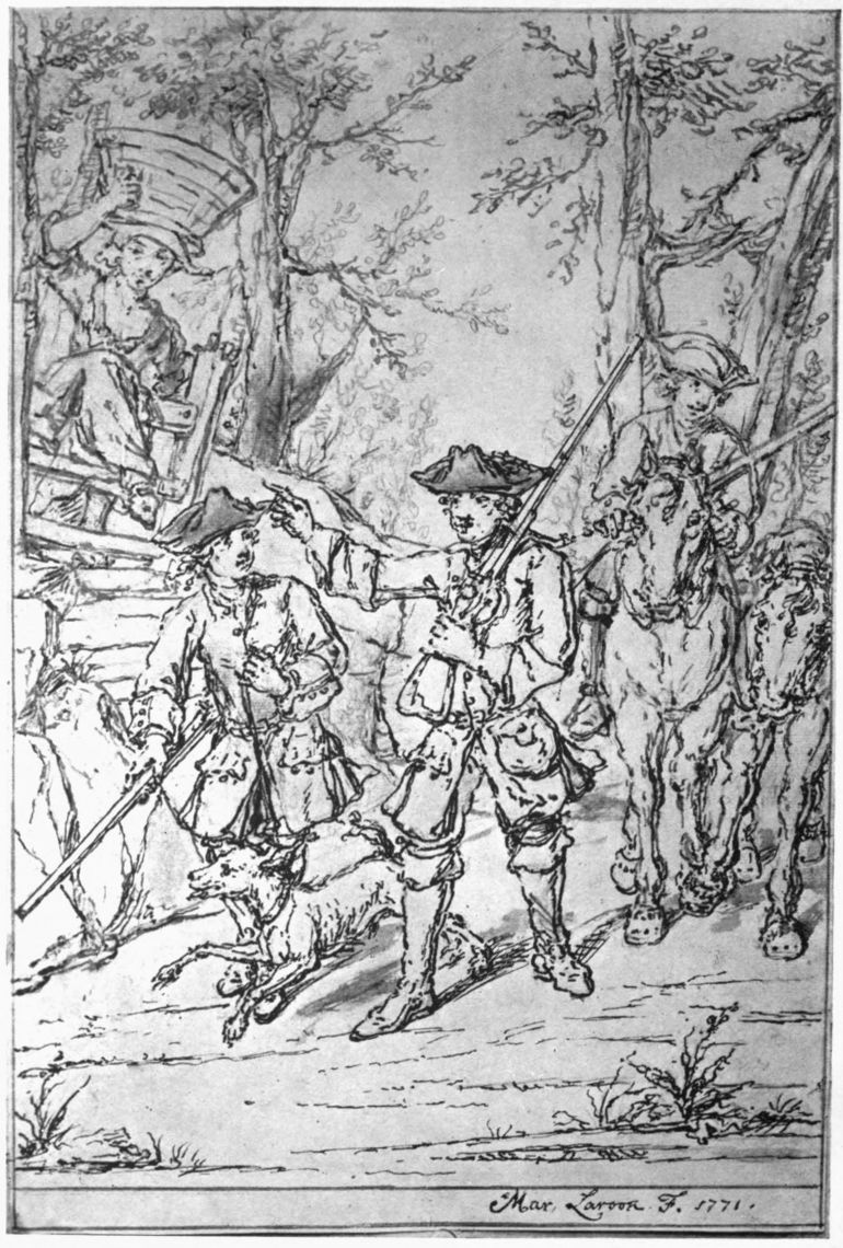 “A HUNTING PARTY.” DRAWING IN PEN AND INK AND PENCIL BY MARCELLUS LAROON IN THE TATE GALLERY. SIZE, 19⅛ × 13 IN.