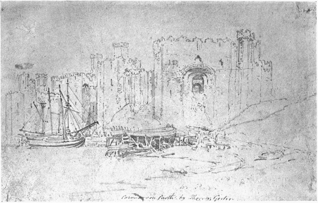 “CARNARVON CASTLE.” PENCIL DRAWING BY THOMAS GIRTIN IN THE POSSESSION OF CHARLES MALLORD TURNER, ESQ. SIZE, 5¼ × 8⅜ IN.