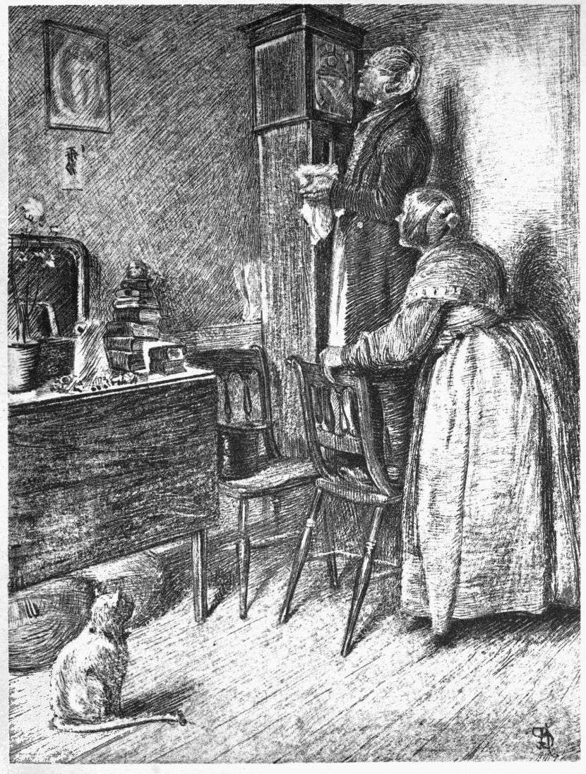 “THE OLD COUPLE AND THE CLOCK.” PENCIL DRAWING BY G. J. PINWELL IN THE POSSESSION OF HAROLD HARTLEY, ESQ. SIZE, 7 × 5⅜ IN.