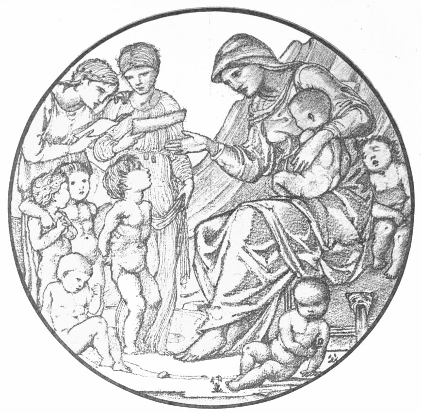 “SEVEN WORKS OF MERCY.” ONE OF A SET OF PENCIL DRAWINGS BY SIR EDWARD BURNE-JONES, BART. IN THE BRITISH MUSEUM. SIZE, 14½ IN. DIAMETER.