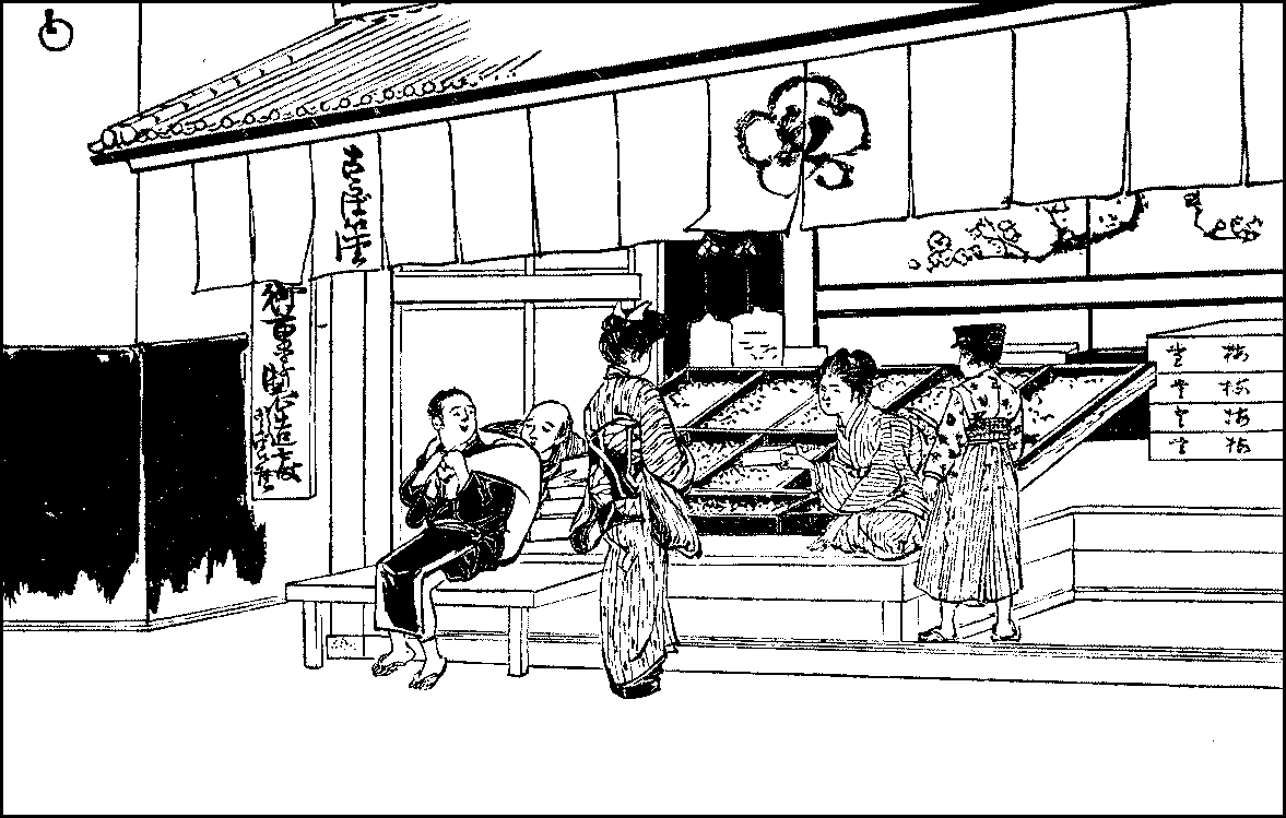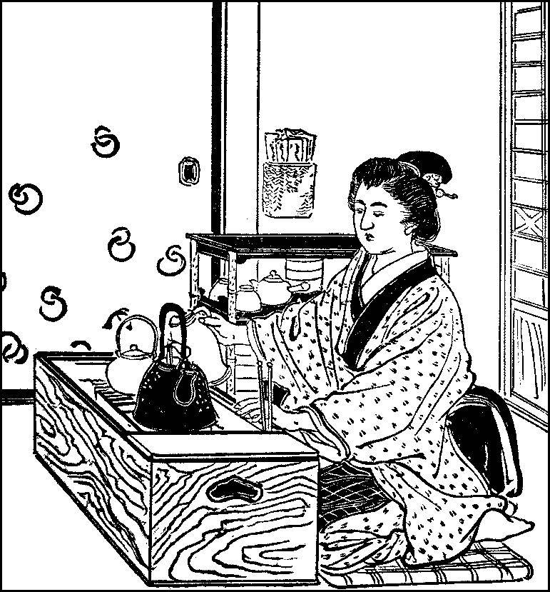 Rice—Sake—Wheat and barley—Soy sauce—Mirin—Rice-cooking—Soap—Pickled vegetables—Meal trays—Chopsticks—Breakfast—Clearing and washing—The kitchen—The little hearth—Pots and pans—Other utensils—Boxes and casks—Shelves—The sink and water-supply—The midday meal—The evening meal—Sake-drinking.