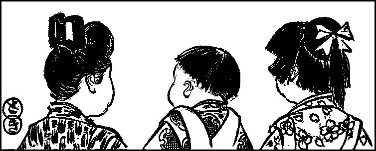Queues—Hair-cutting—Moustaches and beards—Shaving—Women’s coiffure—Children’s hair—“Inverted maidenhair”—Shimada—“Rounded chignon”—Other forms—The lightest coiffure—Bars—Combs—Ornaments round the chignon—Hair-pins—The hair-dresser—The kind of hair esteemed—Lots of complexion—Girls painted—Women’s paint—Blackening of teeth—Shaving of eyebrows—Washing the face—Looking-glasses.