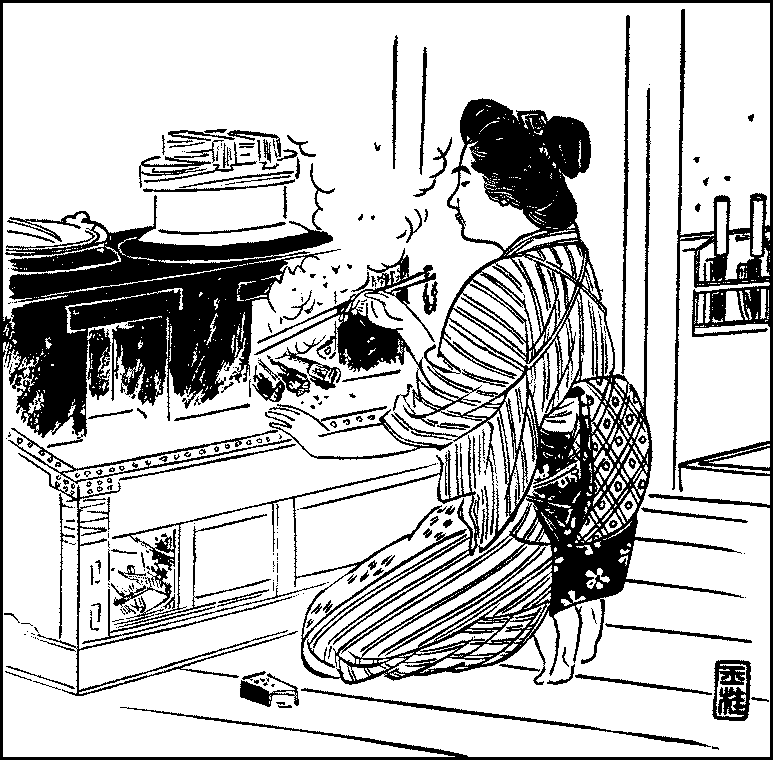On the seventh of July took place the Feast of Tanabata, which is now seldom observed in Tokyo. On this night, according to the legend, the only one in the whole year when the Weaver (the star Vega) can meet her lover the Cow-herd (the star Altair) on the other side of the Heavenly River, as the Milky Way is called, magpies come and spread their wings across the river to bring the lovers together. And this meeting is celebrated with various offerings. The sixteenth of the month is, like the same day in January, the holiday for apprentices and servants. About this time, midsummer presents are exchanged between friends and relatives; but the most important occurrence in the middle of the month is the Feast of Lanterns. On the thirteenth, preparations are made for welcoming the spirits of the dead. The family tomb is visited and washed, while at home the shrine is decorated with festoons of vermicelli, to which are attached ears of Italian millet and panicum frumentaceum, dried persimmons, and the fruit of the torreya nucifera, and the lower part of the shrine is enclosed with a little fence of cryptomeria. In the evening, hemp-reeds are burnt in an earthen pan in front of the porch to receive the spirits who are then believed to enter the dwelling. On the fourteenth, offerings are made at the shrine and a priest is often called in to recite prayers. On the evening of the fifteenth when the spirits conclude their visit, the hemp-reeds are again burnt to speed them; people light their pipes at the fire and smoke as a charm against diseases of the mouth and step over the embers to secure themselves against all ailments in the lower parts of the body.