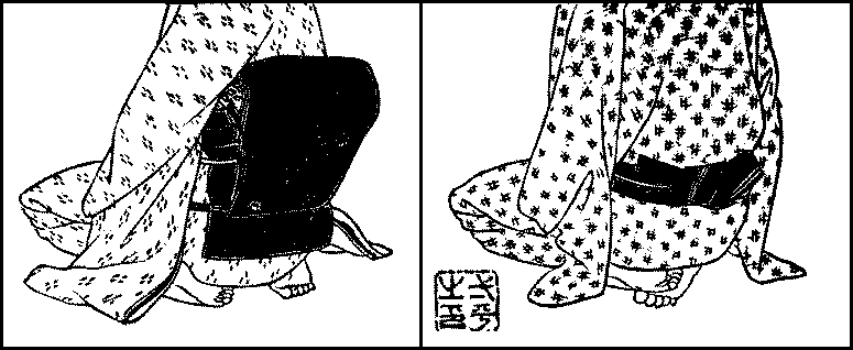 The wrestler appears in the arena without clothing. He has over his loin-cloth a wide, wadded cotton-belt adorned with twine tassels when he wrestles; but if he is a first-grade wrestler, he makes a formal appearance in the arena with others of the same grade before they commence their bouts, when he wears in addition an apron of heavy material richly embroidered with his professional name or some other distinguishing mark stitched in gold.