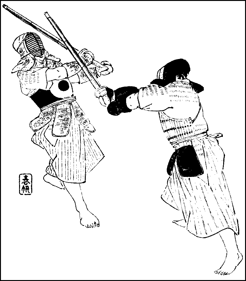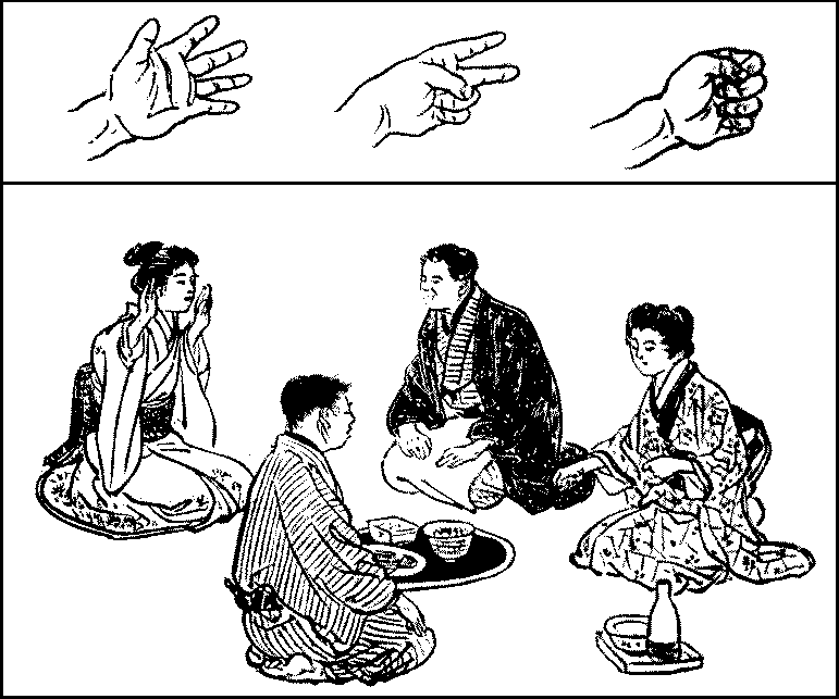 There is a curious diversion called the game of ken, or fists, which, its name notwithstanding, has nothing to do with pugilism. The principle of the game is that there are three positions of the hands or fingers, each one of which beats one and is beaten by the other, of the remaining two. The game is played with one or two hands. That played with both hands is called the fox-ken; its three positions are the putting of the open hands with the palms outward close to the temples in imitation of the fox, the stretching out of the right arm with the hand closed while the left hand is brought to the breast, which represents the huntsman with a gun, and the placing of both hands on the knees to show the staid manners of the village headman. The fox may bewitch the headman as that animal is popularly believed to possess magical powers, but may be killed by the huntsman, who, however, must not shoot the headman; thus, the fox beats the headman, who beats the huntsman, who, in his turn, beats the fox. The game is played by two persons, who must move their hands with uniform rapidity, for the game is spoilt if either side moves more quickly or slowly than the other. It is a favourite game at convivial parties, especially if one of the parties is a geisha, though it is not so popular now as it used{315} to be. The person who beats the other three times running is declared the winner, and the defeated party has, as forfeit, to drink a cup of sake. The stone-ken is played with one hand; in this the closed hand represents a stone, the open hand a piece of paper, and two fingers or a finger and the thumb spread out a pair of scissors; the stone may be wrapped in the paper, but is proof against the scissors, which may, however, cut the paper. This ken is played less often as a game than for deciding in a case where one would toss a coin in England, for tossing up is unknown in Japan.