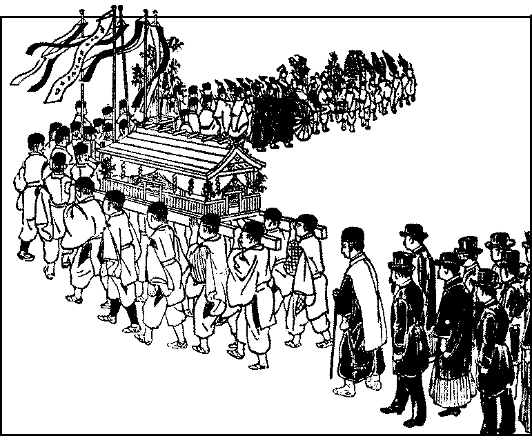 Early in June the irises and sweet-flags flower; there are gardens in Tokyo where these flowers are specially cultivated and shown to the public. June is also the month for the annual fêtes of many local deities. There are nearly fifty shrines where annual fêtes are{300} held in Tokyo; and the greatest of these are the Sanno and Kanda Myojin, whose fêtes were until lately among the famous sights of the city. The fête of the Sanno takes place on the fifteenth of June, while that of the Kanda Myojin is celebrated on the same day three months later.