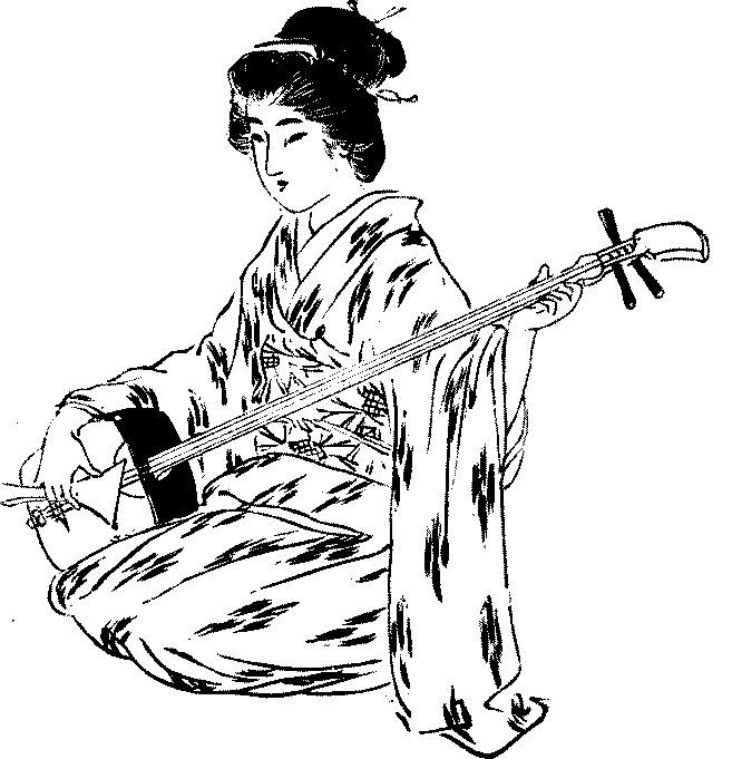 But extensively as the koto is practised by school-girls and ladies of position, the national musical instrument is the samisen, a Japanese variant of the old European rebec which was introduced into the country by the Portuguese in the sixteenth century. In the old days it was considered vulgar to play the samisen, which consequently lay long in obloquy and was only to be found among the merchant and lower classes. But now, though the prejudice against it is still strong among old-fashioned people, it is in greater favour than the koto. It is played everywhere, at home, in story-tellers’ halls and theatres, and at every tea-house party.
