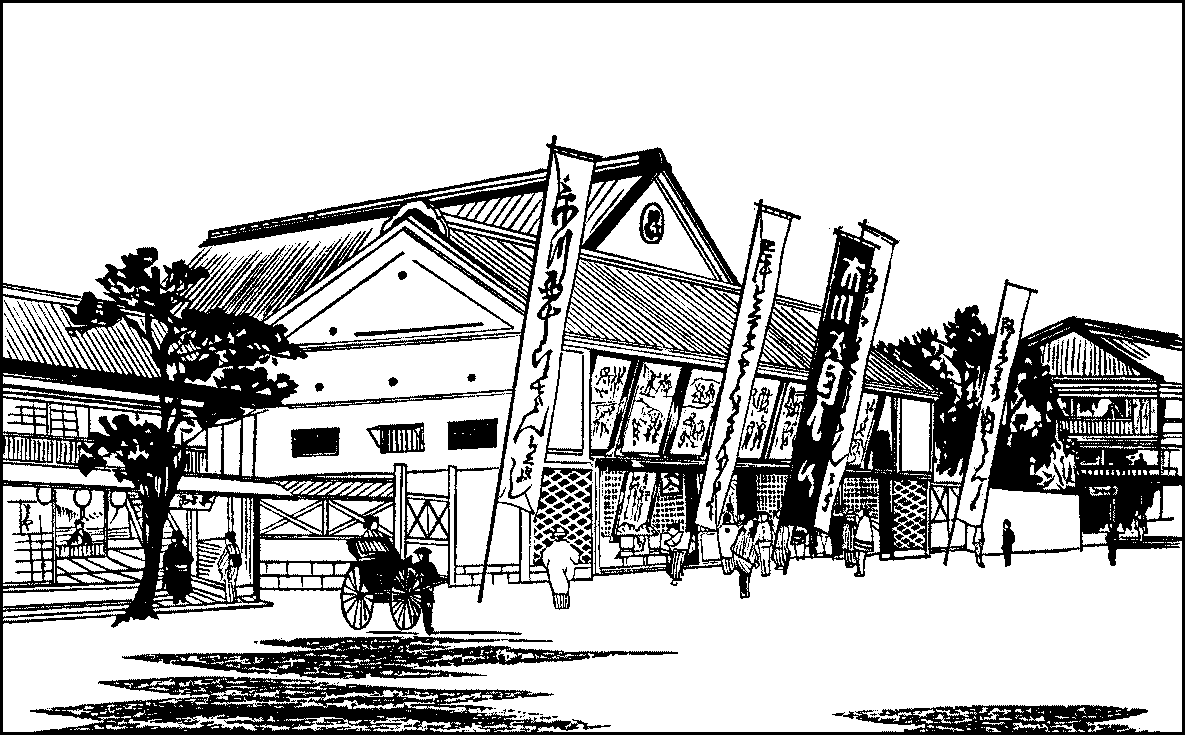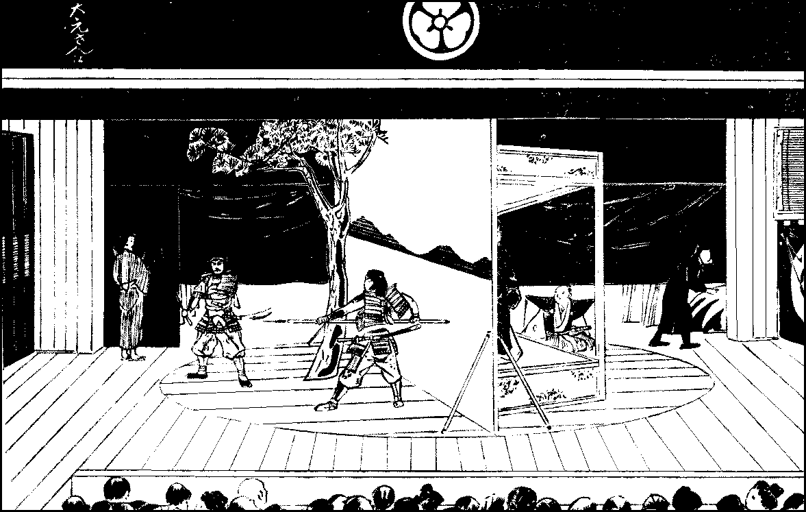 The theatre is a large oblong building. Over the great entrance hangs a row of wooden-framed pictures representing the scenes played; the side-entrances lead to the gallery. In front of the stage as one enters the theatre is the pit, which is partitioned into small compartments capable of holding four or five persons{274} squatting. On either side are two stories of boxes and facing the stage across the pit is the gallery on the second or third story, which is mostly patronised by playgoers who, being unable to pay for the whole performance, come to see one or two of the best acts. From the sides of the stage two entrance-passages run through the pit towards the entrance. Actors walk under the passages to the entrance end and coming out into a box, make their appearance on the entrance-passage. These passages are very convenient as they give a larger room to the stage and impart a sense of distance when it is not expedient to crowd too suddenly on the stage. The stage is screened off from the auditorium by a drawn curtain in the larger theatres and by a drop-curtain in some of the smaller. When a popular actor is playing or some special piece is performing, curtains are presented by the patrons of the actor or the theatre; and in such a case several curtains are drawn one after another between the acts across the stage for the admiration of the audience. Another peculiarity of the Japanese stage is the revolving-stage. A scene is set upon the front half of a turn-table which is flush with the rest of the stage floor; and while that scene is being acted, the carpenters are putting up the next in the rear half; and when the first scene is over, the table revolves and brings the second to view, and so the play is continued without interruption. Yet another peculiarity is the presence on the stage of black-veiled men in clothes of the same colour. They are known as “blackamoors” and supposed to be invisible. At the commencement of a run; they stand or sit behind the actors and prompt them; they remove from the stage any article that has ceased to be of use or pull away the dead in a fight if they are found to be in the way, or push a cushion to an actor when he is about to sit down. They are of great use, though it is hard to acquiesce in the fiction of their invisibility. The stage music is played usually on one side of the stage; but when a gidayu is required, its performers are seated on a high perch to the left of the stage.