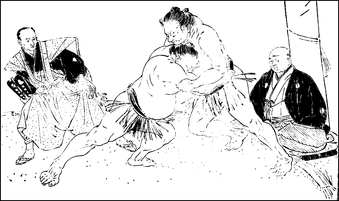 Another public amusement which vies with the stage in popularity is wrestling. Though there are often wrestling bouts in different parts of the city, the great matches to which all lovers of the art look forward every year are those which take place in January and May in the temple-grounds of Ekoin on the south side of the River Sumida; for as they decide the combatants’ position in the profession, they are fought in grim earnest.