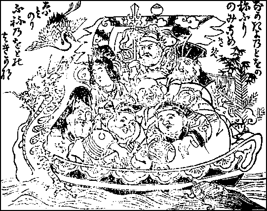 On the second, larger shops send out the first loads of goods for the year in handcarts. These carts are adorned with flags bearing the names of the firms, and the shops pride themselves{291} upon the number of such loads they can send out on this day. In the evening hawkers come with pictures of a treasure-ship with the seven deities of fortune on board; over the picture is written an ode of thirty-one syllables which is remarkable for being a palindrome. It runs thus:—