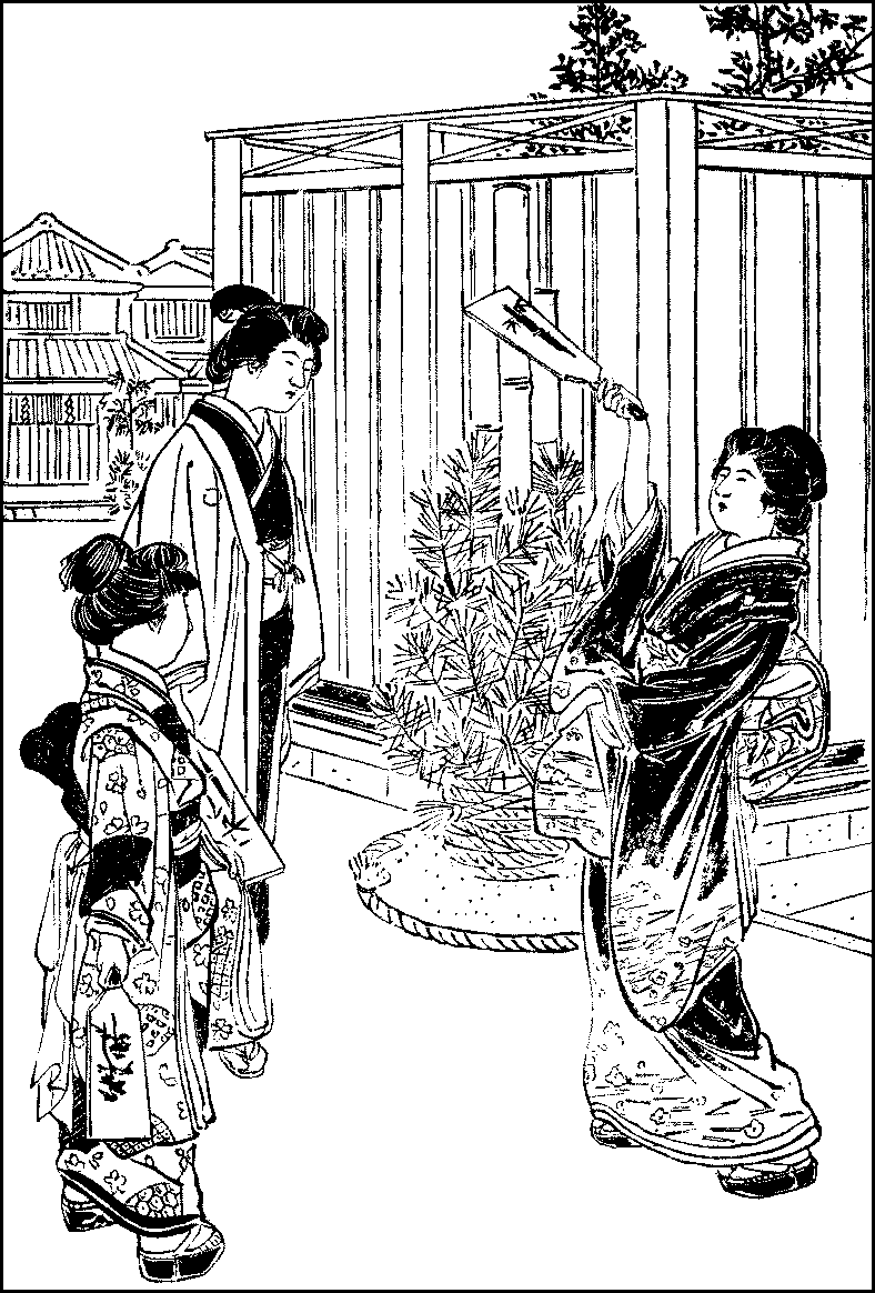 Still there remain many occasions on which the Tokyo cit may take his pleasure at home and abroad. The first of these, the New Year’s Day, presents the gayest appearance everywhere and is a day of general rejoicing. On either side of the gate or front door at every house stands a large pine branch supported by an unstripped bamboo-pole or two, and overhead flies the national flag. On the cross-beam of the gate or over the porch hangs a coil of sacred rope, to which are attached a piece of fern, a lobster, a bit of konbu (laminaria), and an orange. Indoors too, a piece of rope with a frond of fern is suspended in different rooms. In the morning when the family gather for breakfast, a set of three wooden goblets are brought on a stand, and the members of the household wish one another a happy New Year and drink spiced mirin with one of the{289} goblets in the order of their position in the family; and instead of the usual boiled rice, they eat cakes of pounded rice roasted and boiled in a soup of greens. This drinking of mirin and eating of rice-cakes is repeated on the two mornings following. On the New Year’s Day people go out to present the New Year’s greetings to their friends and relatives. This custom is now less observed than formerly; for in these days they greet one another by post, and millions of postcards pass through the Tokyo post offices in the beginning of the year. On the New Year’s Day larger shops are closed, as well as offices, public and private. The streets are gay with the New Year’s decorations and with people going to and fro for the New Year’s greetings; while in streets of shops and small houses young men and women and children may be seen playing at battledore and shuttlecock in the open road to the great obstruction of the thoroughfare, the fun of the game being that those who miss a shuttlecock have their faces smeared with Indian ink or white paint.