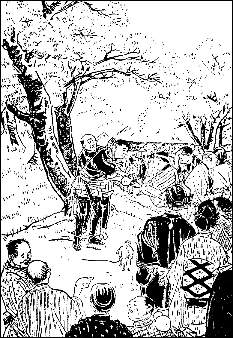 At the end of March bloom the early flowers of the cherry called the higan-cherry; but it is in the first half of the following month that the real cherry season is in full swing. The birthday of Sakyamuni, the founder of Buddhism, is celebrated on the eighth of April, when an infusion of the hydrangea thunbergii is poured over a small statue of the Buddha and the liquid is sold in small{296} green-bamboo tubes to the votaries. It is said to be an effective charm against the breeding of maggots in summer. This ceremony of the washing of the Buddha, as it is called, is soon forgotten in the universal merriment of the cherry-flower season. The lovers of the plum-blossom may dwell upon the superior grace and delicacy of their favourite, but the darling of the nation is the cherry-flower; the former has been lauded by many a poet, but the latter is considered to be peculiarly Japanese, for no other land can boast the magnificent clusters without a leaf to break their continuity, which look in the distance like a bank of pale clouds, and when they fall, the scattering petals come down as lightly as flakes of snow. When we speak simply of the flower, or of the flower-time, flower-view, or flower-season, we allude invariably to the cherry-flower. The high esteem in which the cherry-blossom has always been held in Japan is exemplified in the saying, “Among men the samurai, among flowers the cherry,” which was, in the days of military ascendancy, the highest praise that could be bestowed. Again, how closely the flower is identified with the country, may be seen from the famous ode of Motoori, which runs; “Should a stranger ask what is the spirit of Japan, to him I would show the wild-cherry blossoms glinting in the morning sun.” That spirit is delicate and tarnished by dishonour as readily as the flower is scattered by the wind. The cherry-flowers bloom but for a few days; and that fact gives the motive to a celebrated haiku, or verse of seventeen syllables, which may be lamely translated:—