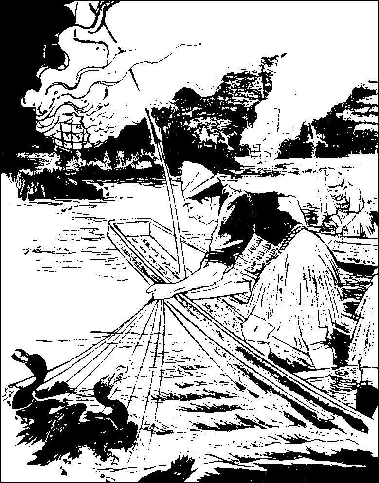 Fishing has many votaries. Boats put off from Shinagawa for{307} fishing in the Bay of Tokyo, especially in summer and autumn; the fish are caught either with nets or with rod and line. Anglers may be seen at all seasons on the banks of the little rivers and canals which traverse the city; but their catch is quite insignificant. The most interesting method of catching fish is, perhaps, cormorant-fishing in the Tamagawa, a river which runs a few miles west of Tokyo, where cormorants are, as in the River Nagara in Gifu Prefecture, which is celebrated for this form of fishing, employed to catch the plecoglossus altivelis, which abounds in the river. The bird has a tight ring around its crop, and when it has dived into the water and swallowed enough fish, the ring is pulled up and the bird is made to disgorge them. Another curious sight is the angling for the sillago. This fish is keen-sighted and very active, and takes fright and darts away as soon as it sees a boat rocking on the water. As, however, it is to be found in comparatively shallow water, a gigantic stool is set on a shoal, and the angler sits on it and patiently waits for the fish to take the bait. A boat remains not far off for emergencies, as when the angler, in his eagerness, loses his balance and goes bodily after the sillago. On a calm day, several of these stools are to be seen off the beach at Shinagawa.
