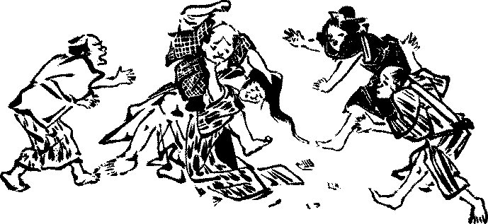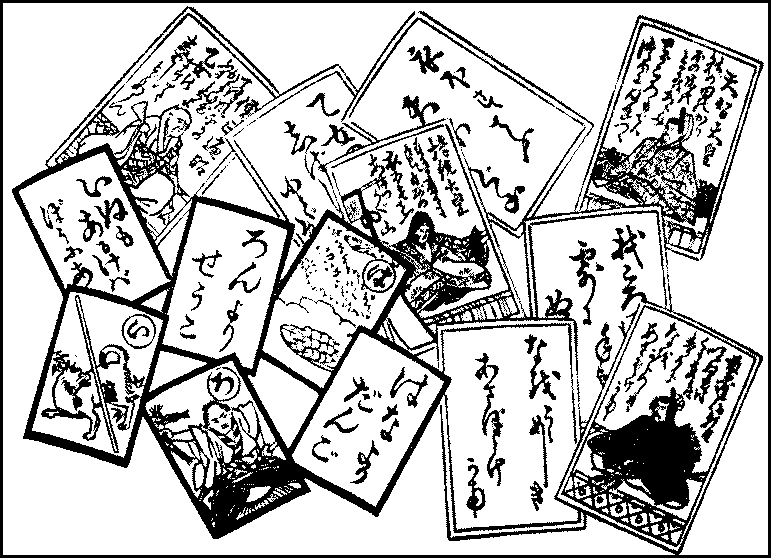 Sugoroku is played in the long winter evenings, and especially during the first days of the New Year. Among other New Year’s games may be mentioned the cards known as the Iroha and uta cards. Iroha, being the first three characters of the Japanese syllabary or alphabet, is the name given to the whole syllabary; and the iroha cards are so called because they have inscribed on them each a proverbial saying beginning with a different character of the syllabary. There are forty-seven characters in the Japanese syllabary, and another card is added to make the number even and{311} divisible. Besides the pack of forty-eight cards with the proverbs, there is another of the same number of cards with pictures corresponding to these proverbs; these latter have also marked in the corner the first character of the proverbs they illustrate to facilitate identification. Thus, if the card in the first pack has the proverb, inu mo arukeba bō ni ataru (A dog, by walking, may come upon a stick, a saying which is now taken to mean that by wandering about, one may meet with good fortune), the corresponding card in the other pack has a picture of a dog knocking against a stick and the character i in the corner. The card of the second character of the syllabary has the proverb, ron yori shōko (Proof is better than argument), and the third has hana yori dango (Better a dumpling than a flower, that is, use is better than ornament), and so on. The illustrations in the second pack are often fanciful, as they cannot but be when the proverbs do not refer to concrete objects. Thus, the illustration to the second proverb above given has an angry man with one hand on his sword and holding in the other the straw figure which the jealous wife used in the old days to nail to a tree at dead of night when she invoked curses upon her rival. The man is apparently showing his wife in spite of her protestations the straw image she has been using against his mistress. The game is played sometimes by spreading all the pictures in the middle and the players sitting around them. One person reads out the proverbs in any order he pleases, and the corresponding pictures are seized and put away. The player who has taken the largest number of cards in this way is the winner. The game, however, is more frequently played in the following manner:—The cards are dealt evenly among the players who spread them out exposed before them. When a proverb is read out, a player takes out the corresponding picture if he has it, and if not, he looks over the other players’ hands and seizes the card as soon as he sees it. He takes it and gives one of his own exposed cards to the player from whose hand he has taken it. A slow-witted person’s hand is always full, while a sharp player clears his quickly; and the one who has first got rid of his hand is the winner. As the cards are often pounced upon at the same time by several players, the game is an exciting one, and not a few come out of it with their hands scratched and bleeding. Friends and relatives of both sexes join in these games in winter evenings, and some of them, it is said, consider it the best part of the game that they can touch or squeeze the hands of the players of the opposite sex by pretending to seize the same cards. For this reason, a strict paterfamilias not unfrequently forbids his household to play the game with those who are not its members.