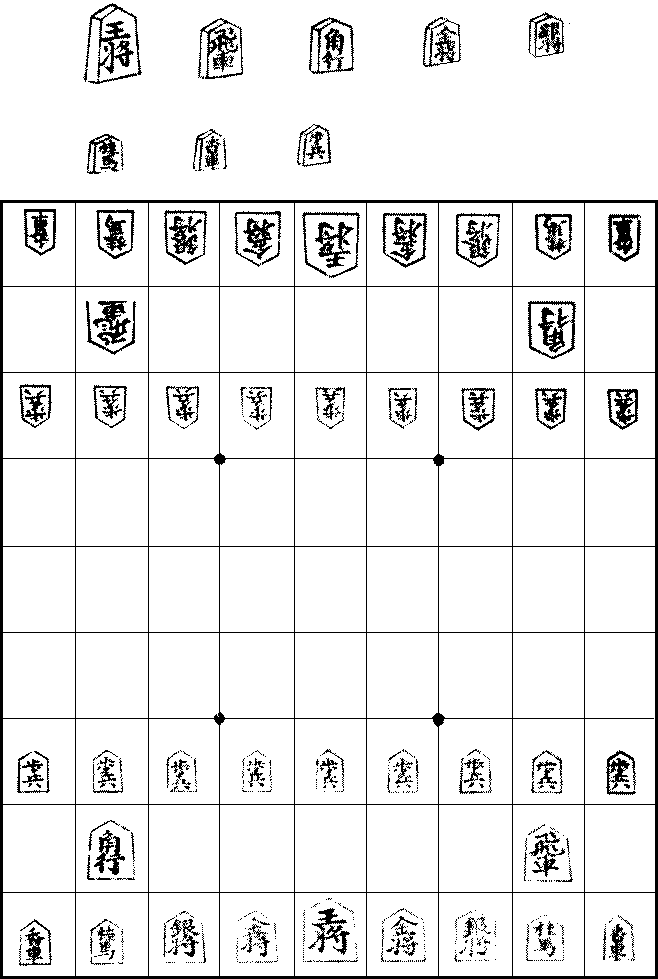 Shōgi, or Japanese chess, is played on a board with nine{316} squares a side, or altogether eighty-one squares. There are twenty men on each side. The nine men on the end-row are the king in the middle, with kinsho (gold general), ginsho (silver general), keima (knight), and kyosha (kind of rook) on either side; on the second row the men are hisha (rook proper) and kakko (bishop) on the second square from the right and left ends respectively; and the third row is filled with pawns. The pieces are all of the same form; they have each a base with two converging sides surmounted by two others which make an obtuse angle at the apex, and are thicker at the base than at the top so that they can readily stand, though they are always laid flat. The name of each piece is written on the upper surface. The largest of these men is the king, next to which are the pieces on the second row, followed by the men on the end-row, while the smallest are the pawns.