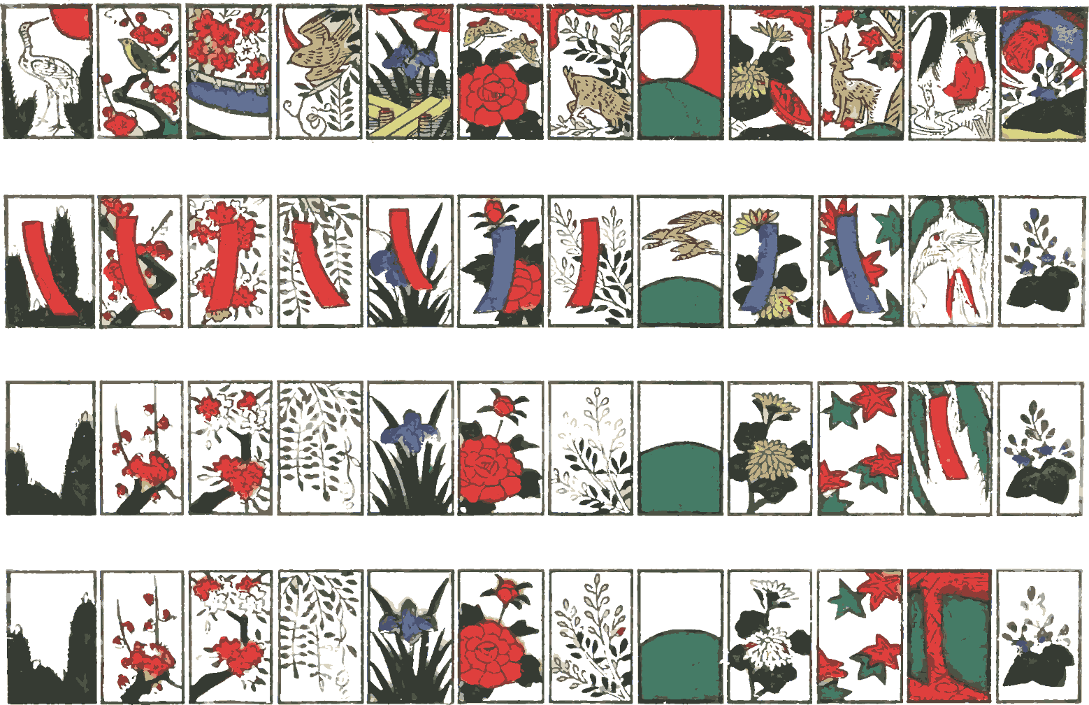 The pack is made up of forty-eight cards, about an inch by an inch and a half, which are in twelve sets, each set representing a month of the year. The first set has a picture of the pine-tree, which, being the principal part of the New Year’s outdoor decorations, symbolises the first month. It is followed in order by the plum-tree, cherry-tree, wistaria, sweet-flag, tree-peony, and lespedeza, which flower in the second, third, fourth, fifth, sixth, and seventh months respectively. The eighth month is represented by the eularia, the ninth by the chrysanthemum, the tenth by the maple-tree, the eleventh by the willow-tree, and the last by the paulownia. It may be stated in passing that these months follow the old lunar calendar and are therefore some weeks later than the corresponding months of the solar calendar. All the cards are not of the same value. The highest, which is twenty points, is assigned to the pine-tree with a crane in the middle and a red sun above, the cherry-tree in bloom with a curtain underneath for a picnic party, the eularia under the full harvest moon, the willow under which a great scholar is learning perseverance from a frog which succeeds after many hours’ vain attempts in reaching a branch, and the paulownia with the phœnix flying over it. Ten points each are given to nine cards, namely, the plum-tree with the bush-warbler, the wistaria with the cuckoo, the sweet-flag beside a plank path, the tree-peony with butterflies, the lespedeza with the wild boar, the eularia with wild ducks, the chrysanthemum with a wooden cup for the chrysanthemum-sake, the maple-tree with the stag, and the willow-tree with the swallow. Five points are the value of the cards with a tanzaku, a long strip of paper for an ode; there are ten{322} of them, that is, all the sets except the eularia and paulownia. The remaining twenty-four cards are worth only a point each. Thus, five cards at twenty points, nine at ten points, ten at five, and twenty-four at a point each, make the total value of the pack two hundred and sixty-four points.