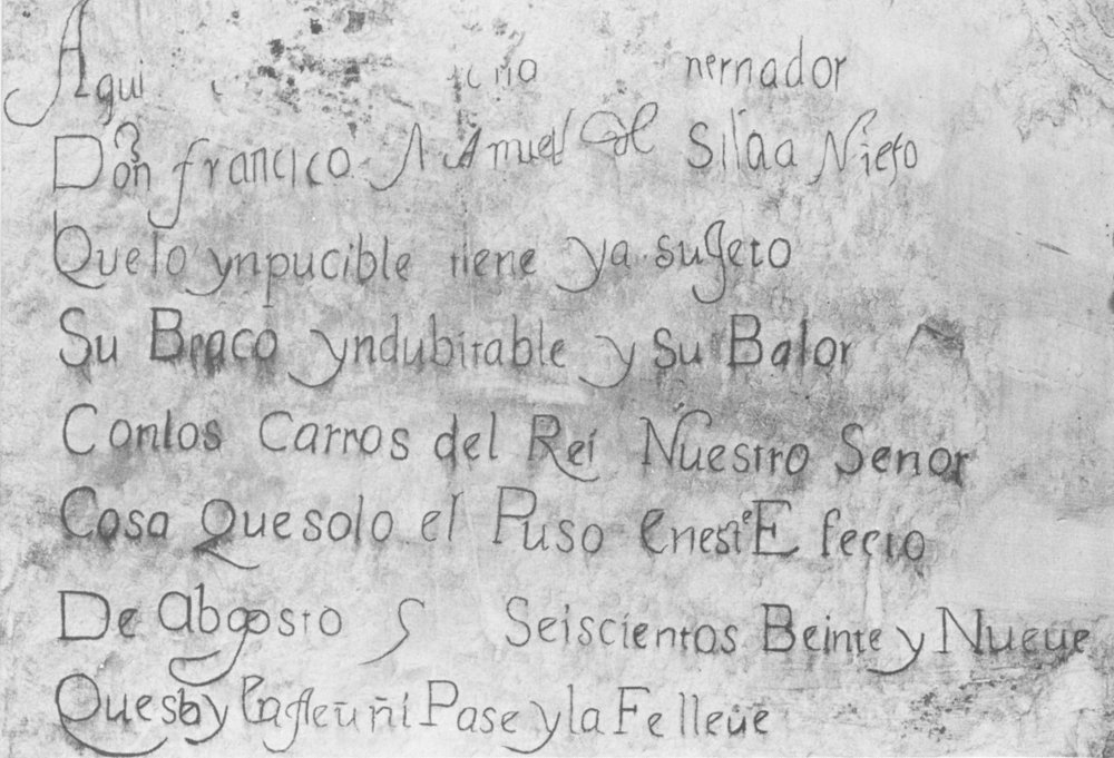 “I am the captain General of the Providence of New Mexico for the King our Lord, passed by here on the return from the pueblos of Zuñi on the 29th of July the year 1620, and put them at peace at their humble petition, they asking favor as vassals of his Majesty and promising anew their obedience, all of which he did, with clemency, zeal, and prudence, as a most Christian-like (gentleman) extraordinary and gallant soldier of enduring and praised memory.”