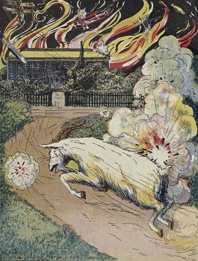 But when the dogs arrived within speaking distance they were overjoyed to hear the goat baa out, “Hello, old chum! How in all that is wonderful did you get here? I heard you were dead; that you had been seen with a Red Cross ambulance which had first been gassed and then blown up by a shell. One of your friends said he saw you with his own eyes sitting in the back of the ambulance when[19] the shell struck it, and the next thing he saw was the whole ambulance flying up in the air and then coming down in small pieces.”