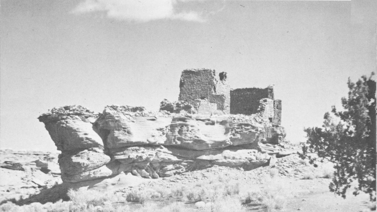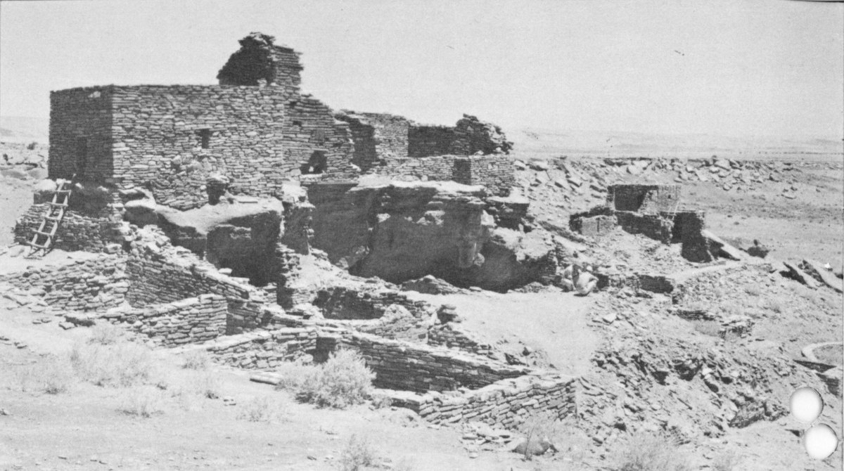 Above is a picture of Wupatki Ruin as it appeared after excavation and partial restoration under the CWA program in the 1930’s. Since then the National Park Service has developed a policy to preserve rather than restore archeological structures. For this reason, the restored portions were removed. We believe the ruin as it appears today leaves one with a greater feeling of admiration for the prehistoric builders than it would with any added restoration.
