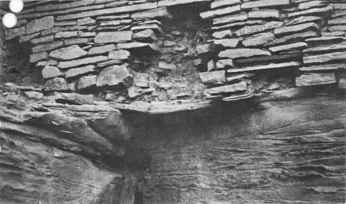 Notice the small opening in the wall above the stone-lined trench. With the trench below, it was used to conduct air to the interior rooms of the structure. As the dwelling was extended toward you from the higher portions, the added outside rooms blocked air from the older ones, necessitating a series of vents to take fresh air to the interior rooms.