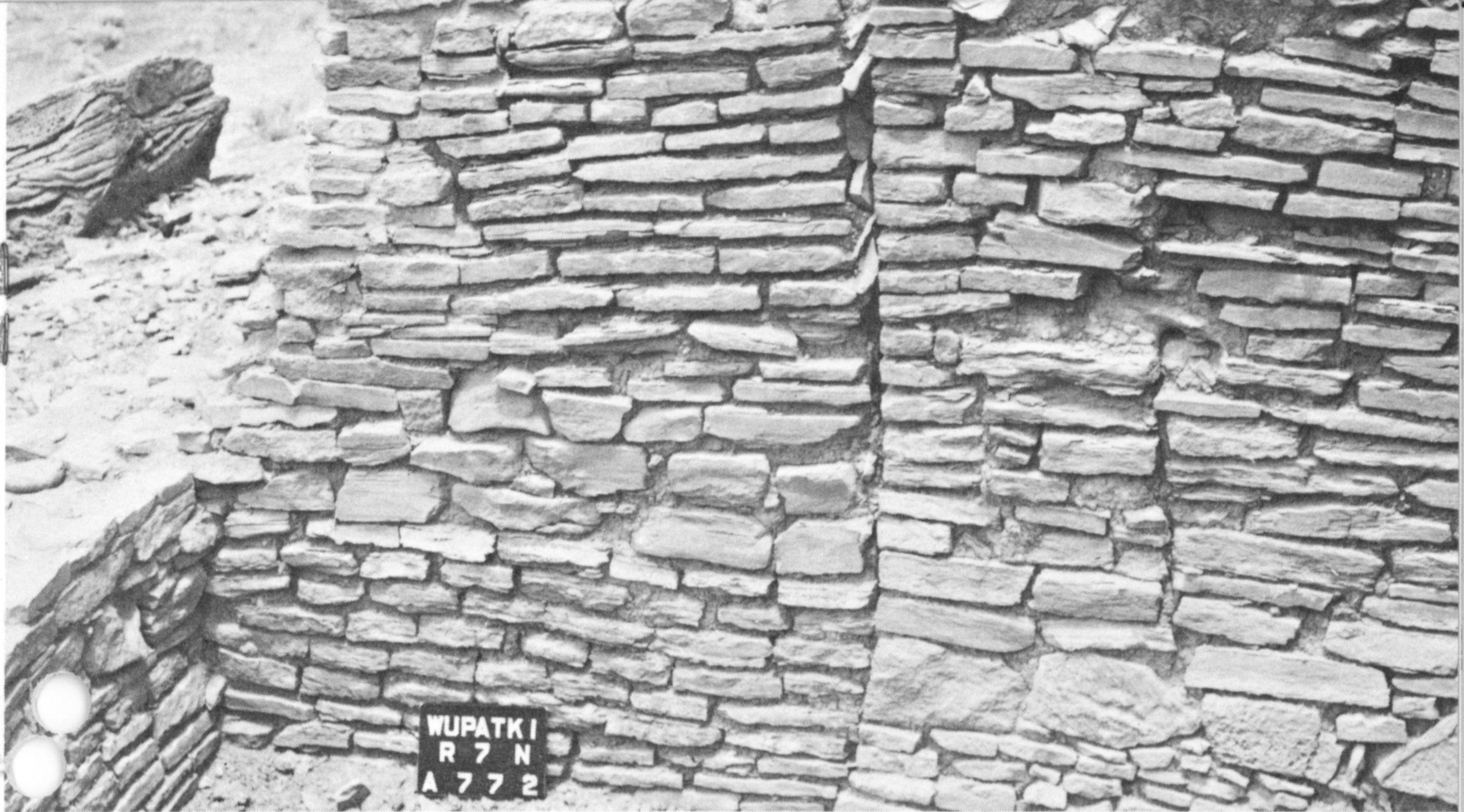 Original timbers are still in place above the opening in the rear wall. Holes for beams that supported the second story are visible in the side walls. A considerable number 9 of beams was recovered during the excavations at Wupatki, and the study of this material has contributed greatly to the tree-ring method of dating in the Southwestern region.
