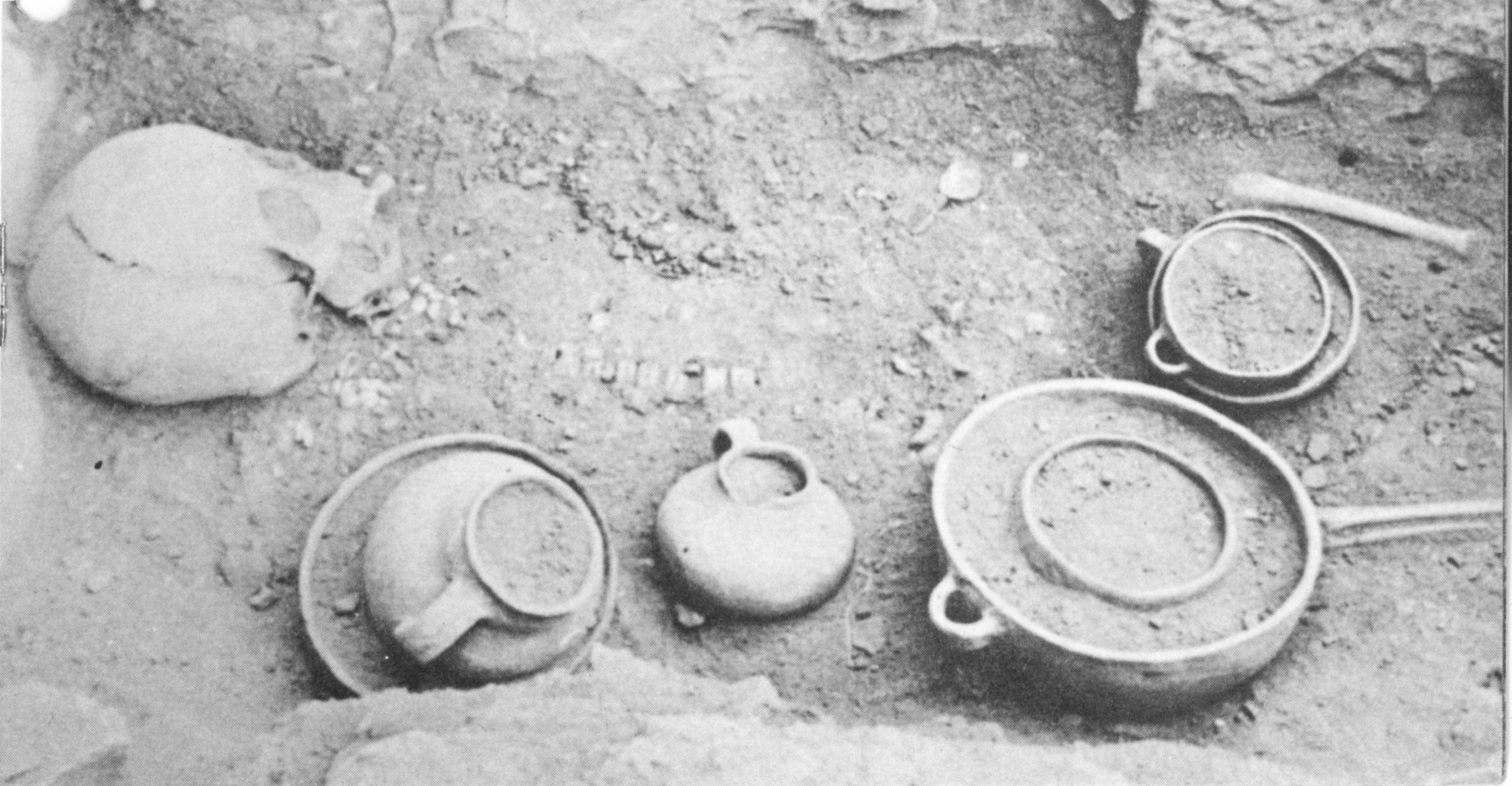 Archeologists uncovered a quantity of material by carefully excavating such rubble as this. The more fragile material on the floor, such as pottery, was in most cases crushed or scattered by falling rocks when the ceilings or walls collapsed. Because the excavators saved all fragments of pottery resting on the floor, they were able to restore many of the broken vessels, some of which exhibit beautiful designs in black on a white background.