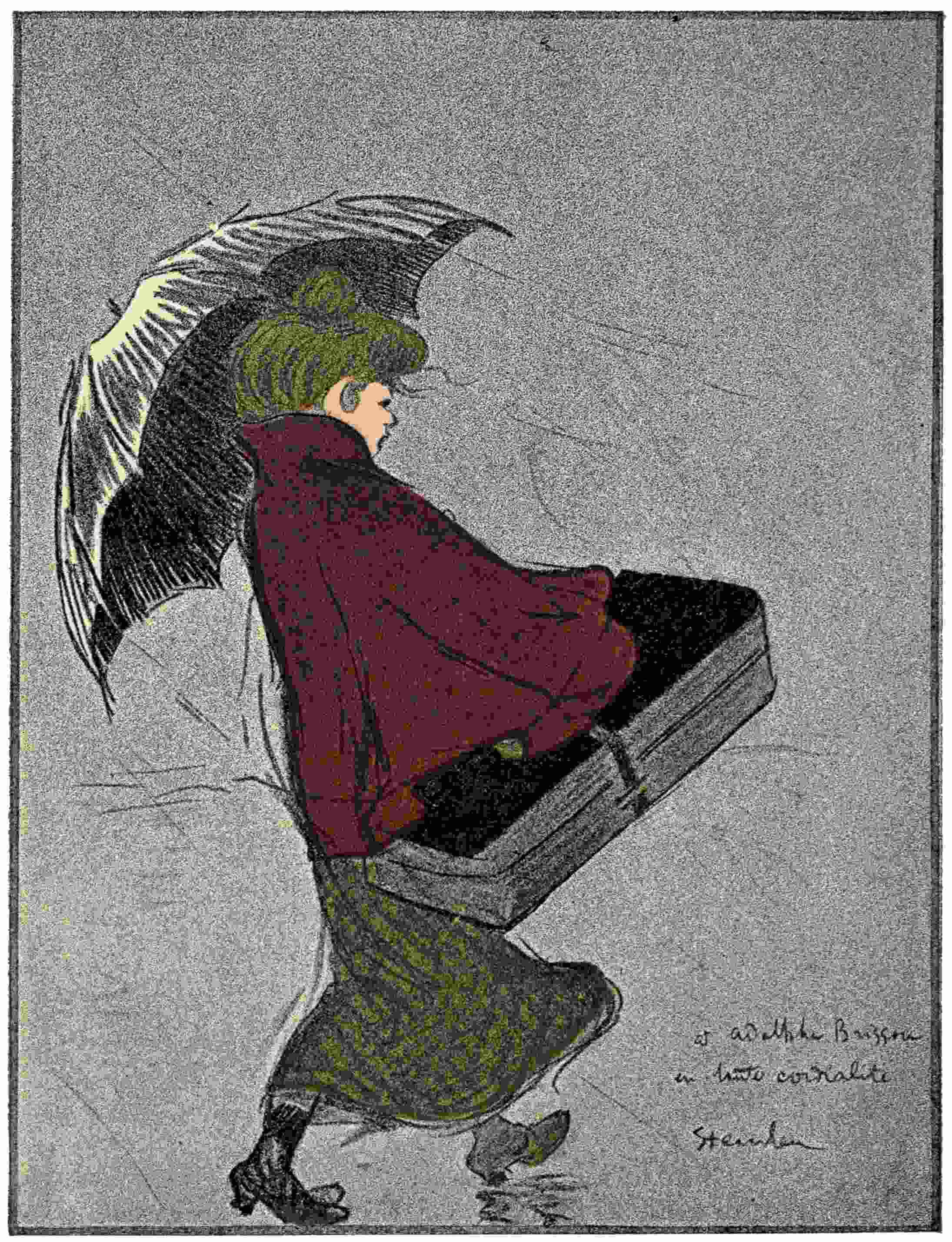 But such a gallery would be incomplete were it to pass by without example the strength of Steinlen, the dainty elegance of Wély or Morin, Huard’s types of provincialism, Forain’s delicacy of design, or the humorous observation of Caran d’Ache. To be complete and cosmopolitan it must chronicle within its walls something of that defiance of convention, that exuberance of youthful audacity, seeking ever fresh paths within the unexplored—above all, that single-minded devotion to art for its own sake which belongs to these Illustrators of Montmartre.
