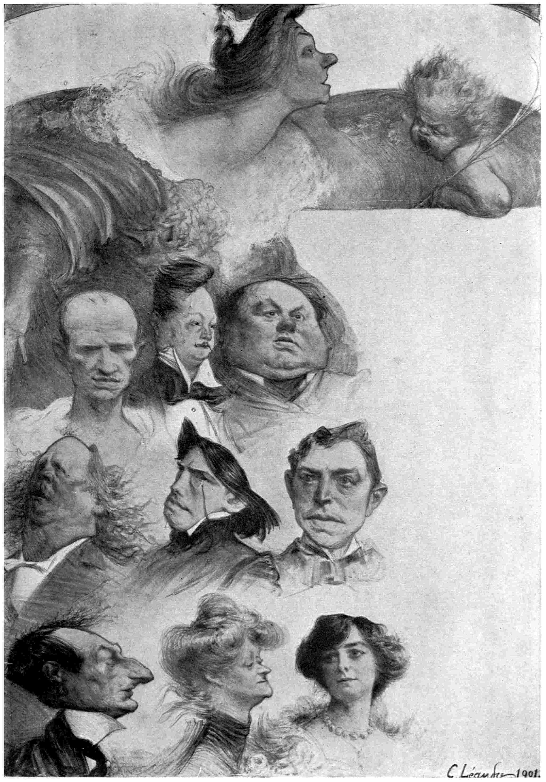 It must not be imagined from the foregoing that portrait caricature alone occupies the pencil of our artist. His book of subtle wash drawings entitled “Nocturnes,” and the lively pages of Le Rire, L’Album, L’Assiette au Beurre, and other journals are embellished with his cartoons and comic drawings, covering a fairly wide range of subjects. He is moreover a serious portrait-painter of great feeling and delicacy. We may look on him almost as an animalier, or natural history artist making a speciality of that droll, brainy, beast—man, recording all his different varieties, and watching his every gesture and movement.