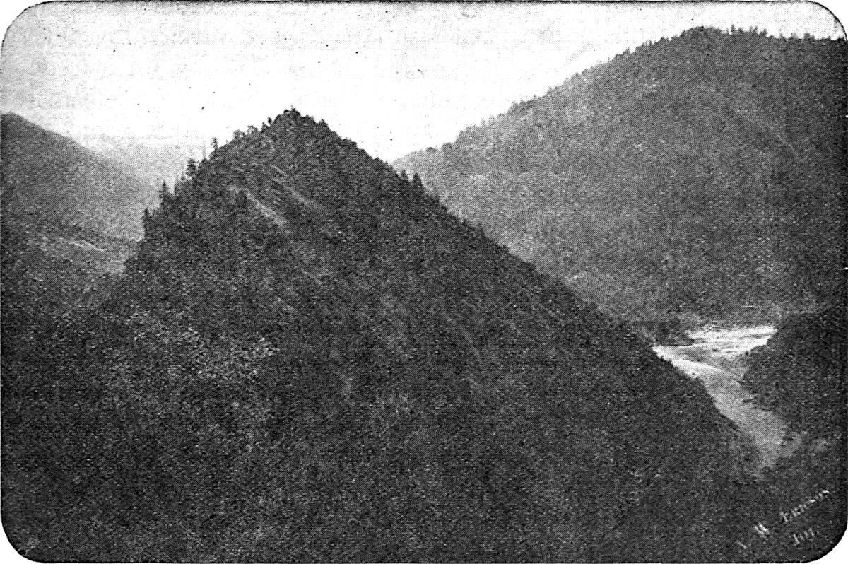 THE Old Klamath Bluffs Store, or fort, and in late years the Klamath Post Office, was built in 1855 or 1856, by a man named Snider. He conducted it as a trading post for Indians, soldiers and travelers alike. It was built of rough split lumber and strongly made of double walls with sawed blocks four inches thick placed between the walls, and was bullet proof, with port-holes so that a few white men could defend themselves against many Indians. This store is located twenty-four miles up the river from its mouth, and is about eighteen miles down the river from Weitchpec or the junction of the Trinity River, and something like forty miles below Orleans Bar on the Klamath. Orleans Bar was at one time the County Seat of Klamath County. The old store is on the north bank of the river on a bar that was formed in ancient times, and is high enough to make it safe from all high waters. It is a beautiful, sunny spot and on the line of travel up and down the Klamath river.