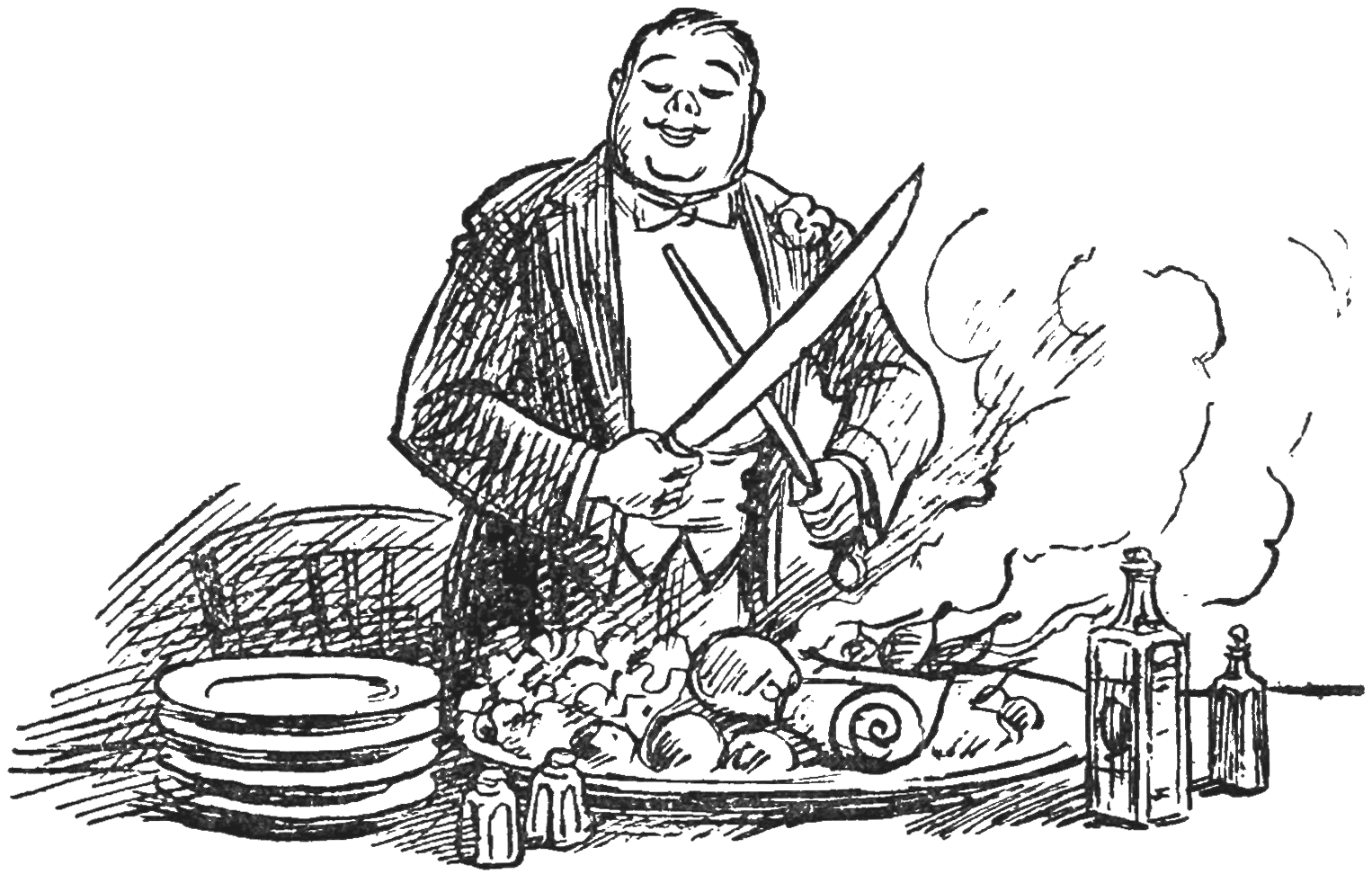 Out in the bland freshness of the suburban morning, Mr. Frogbones was enjoying his garden. In twin beds under the tall French windows the gardenias and sunflowers were just opening towards the violent orb. Sweet peas and daffodils and vast claret-coloured roses aspired upon a green trellis. “How I love a little nosegay,” he said, as he clipped off a couple of dozen of the great cider-tinted chrysanthemums, and bore them indoors to his wife. In the breakfast room a well-trained maid servant was putting the fragrant coffee on the table and the children were drinking their morning milk with neatness and gusto. “Elise,” said Mrs. Frogbones to the maid, “you may bring in the sausages, kidneys, bacon, scrambled eggs, anchovy toast, marmalade, grape fruit, porridge, raisin bread, and gooseberry jam. Mr. Frogbones is ready for breakfast.”
