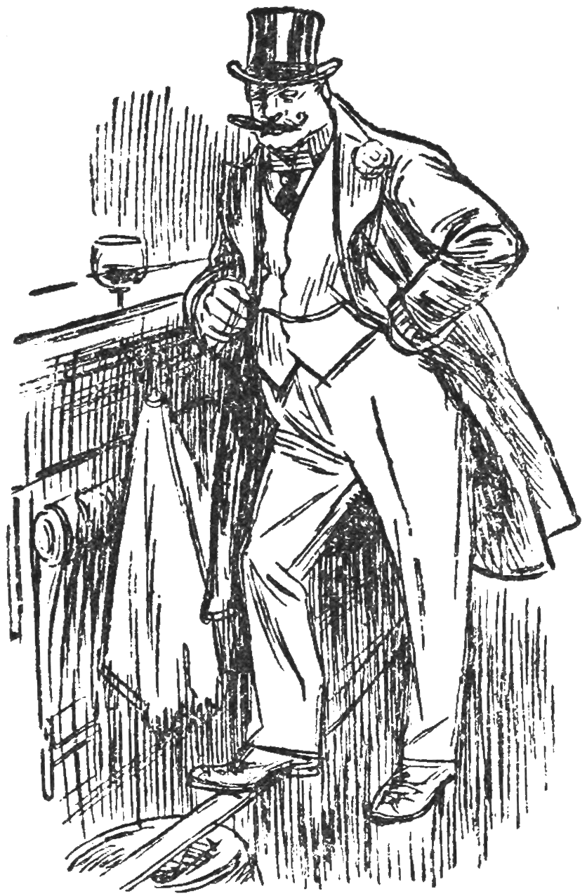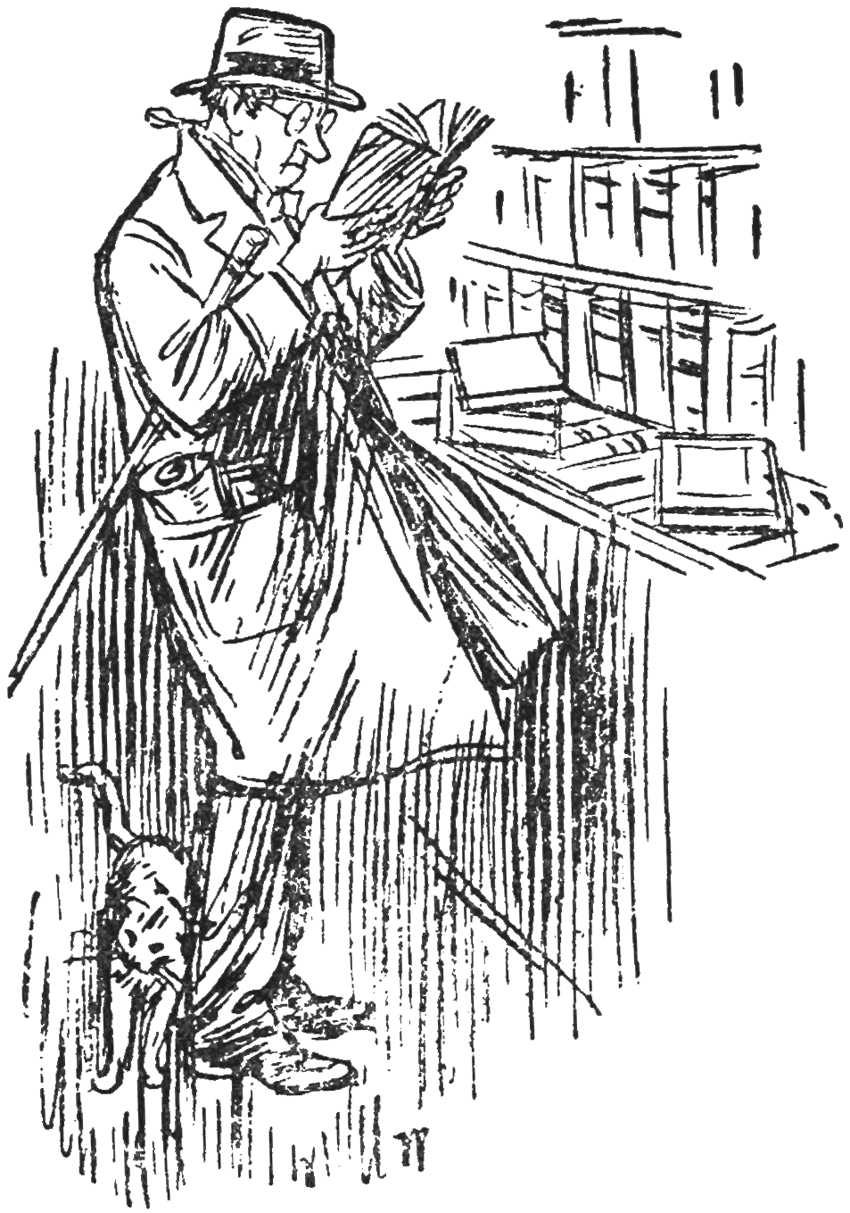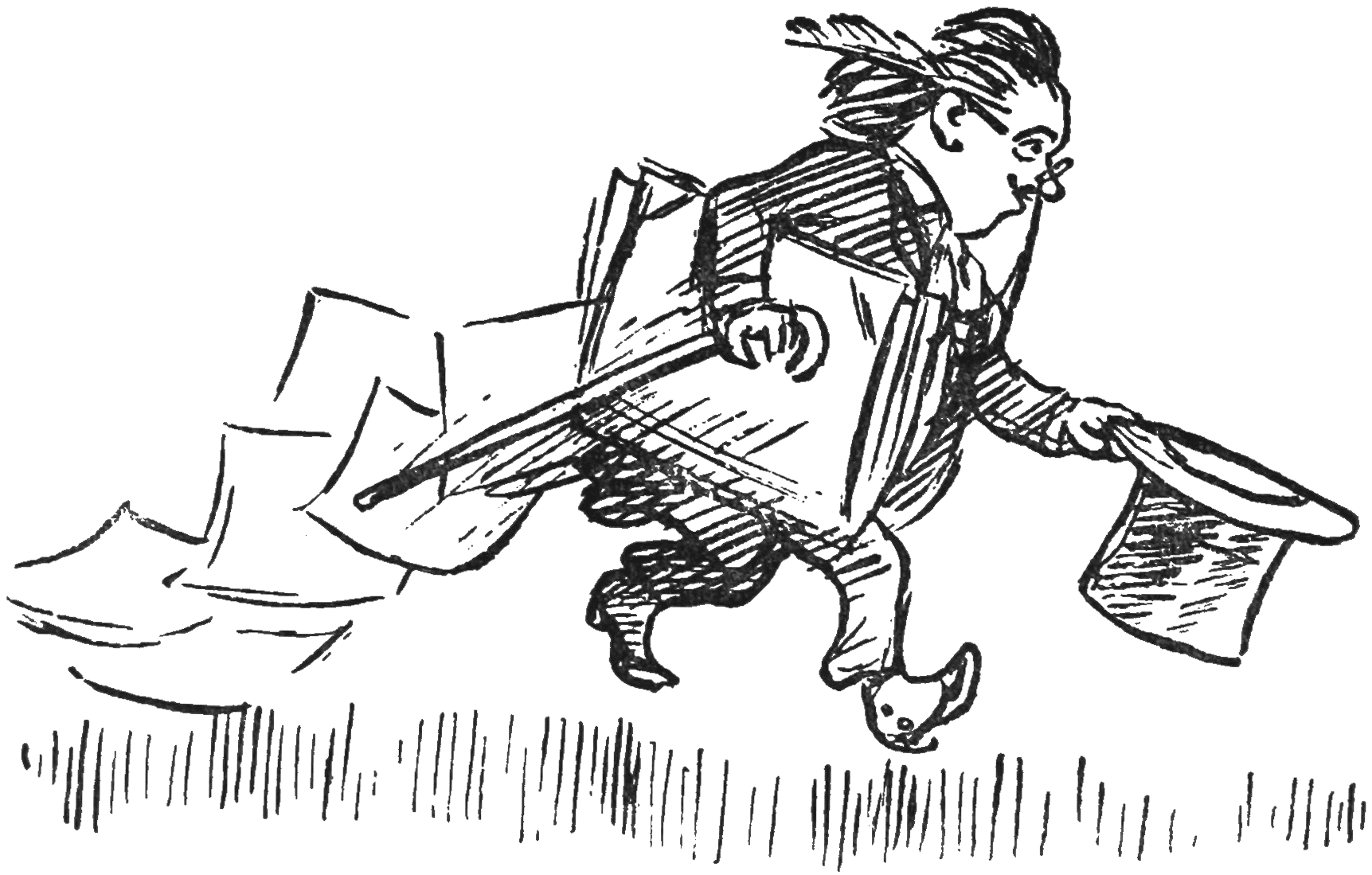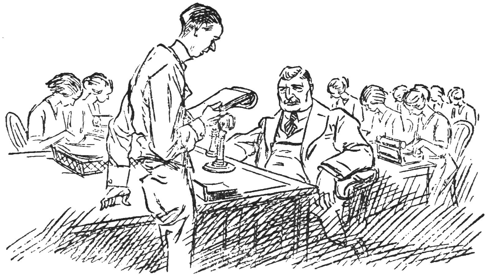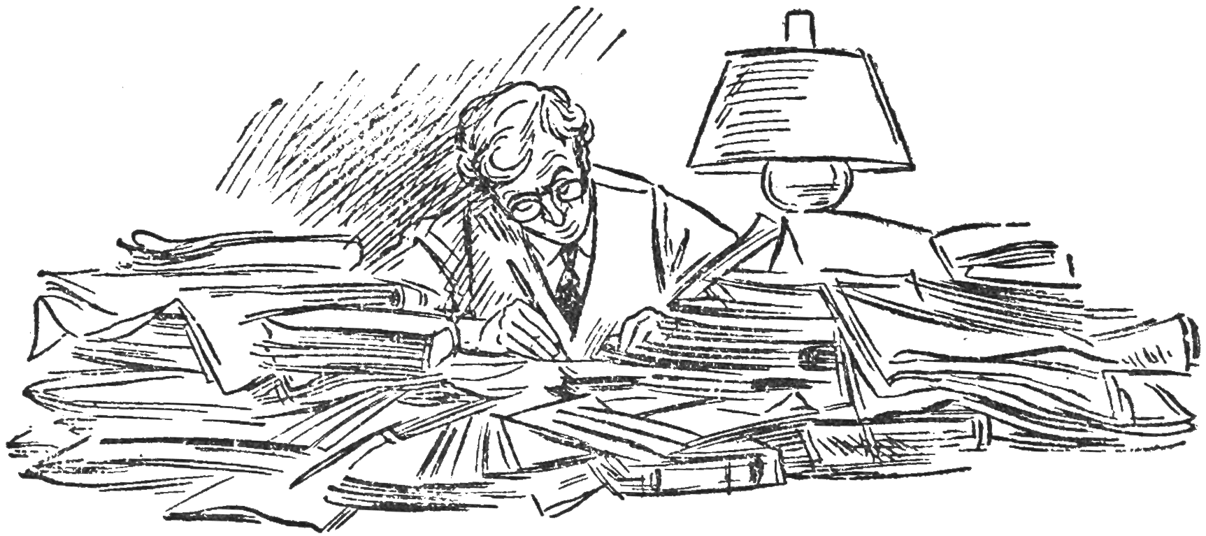 As Henry Frogbones finished his ample breakfast the large absinthe-coloured limousine rolled with a quiet290 crunch across the terrace which was pebbled with small blue gravel. He slipped on his new herringbone surtout, lit a fine black cheroot, hitched up one spat which had got twisted, and rolled away to town. Ambrose, the chauffeur, was accustomed to his employer’s ways: he drove gently so that Mr. Frogbones could read the morning paper with comfort. After an hour’s ride through exquisite scenery [if the editor pays more than five cents a word, it may be well to describe this scenery] Mr. Frogbones reached his office, where the morning mail had already been opened and classified by a competent assistant. In the anteroom a number of callers were waiting, held in check by a respectful young man who was explaining to them that no one can possibly disturb Mr. Frogbones until his morning article is written....