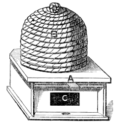 P.S. I have never had an opportunity of keeping bees in England. I shall look for your promised manual, as I hope some day I may be able to have some of my favourites to care for. I may add, my father procured our original stock from Tasmania, in the common straw hive, a bit of pierced tin fastened over the entrance. -xii- One system I do not see alluded to, which we found answer very well, when we wished, for any cause, to take the old comb and start the bees afresh. We used in the early dawn to place the full hive over an empty one, covering all with a large cloth, and then beat the top hive steadily, not roughly, with a stick. Very soon the queen would take refuge in the lower box, when a board was slipped between, and the upper old hive removed. The bees (the few that loitered behind the queen) soon left the honey to join their friends: at night the new hive was carried to the site of the old one, and turned up upon its own board. We always had cross bars of wood on the hives, upon which the swarm at first clung.