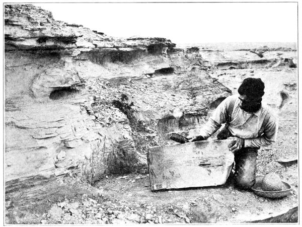 The sharp-eyed searcher after fossils detects these protruding, often broken and weather-worn, petrified bones, which themselves betray the presence often of other parts of their skeletons still concealed in the chalky hillside. Fortunate is he if he has discovered a specimen soon [Pg 10] after it appeared at the surface, before the rains have washed away and destroyed most of the remains that had been there preserved. Still more fortunate is he if all or nearly all of the original skeleton has been preserved together in its natural relations. After days, perhaps weeks, of labor, the specimen is secured and shipped to the laboratory. Those parts which have been washed out of the chalky rock before the discovery of the specimen are always more or less injured and for the most part lost, their fragments strewn down the hillside, for erosion is always slow and many years may have elapsed since first the specimen had appeared at the surface. More frequently, perhaps, a few strokes of the pick and shovel disclose but one, two, or three bones remaining in the rocks. The specimen, if large, or composed of many bones, is carefully uncovered sufficiently to show its extent, and then, so far as possible, removed in large blocks of the rock. The bones themselves, notwithstanding their petrifaction, are usually soft and easily broken, and their separate removal from the matrix may require weeks or even months of labor, work which cannot be done prudently in the field.