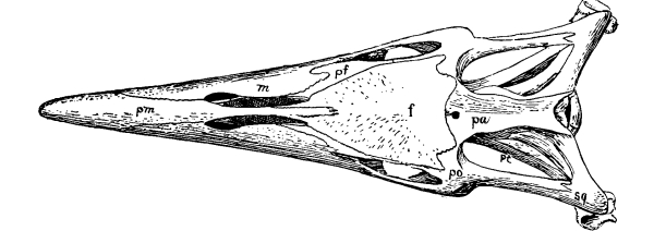 The shell was depressed; the dermal plates covering the ribs had almost entirely disappeared, remnants only of their upper ends remaining; the skull (Fig. 127) had the temporal region wholly roofed over; the neck was short and not retractile. The front legs were strong flippers, the humerus was long and stout, with the crest for the attachment of muscles far down on the shaft; the digits were greatly elongated and clawless, etc. The plastron only was less reduced than in the case of the modern sea-turtles. No traces of horny shields have been discovered. As to the nature of the covering and the general appearance of the turtle when alive, Dr. Wieland has kindly given the writer his views, as follows: