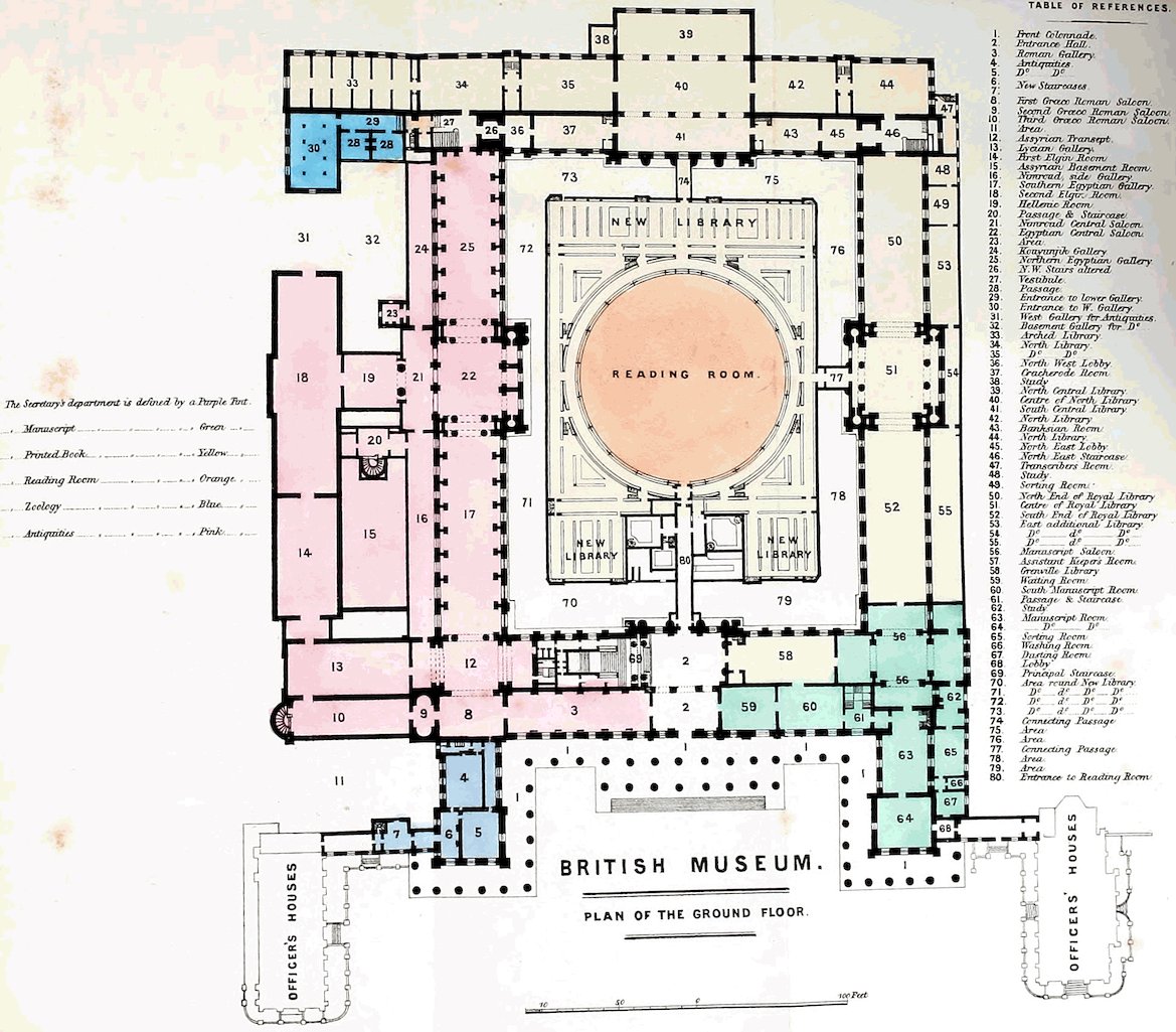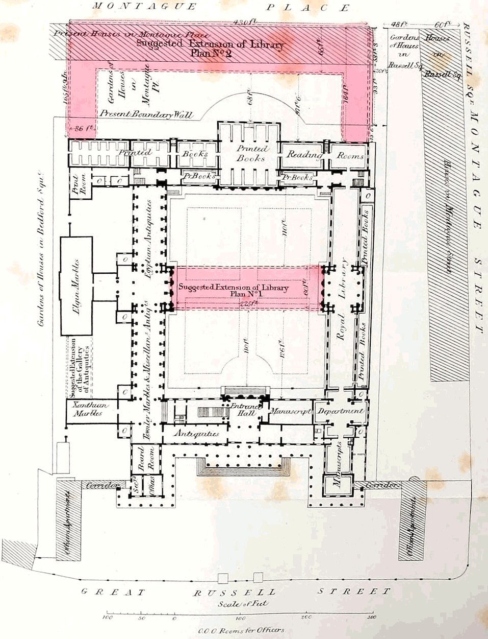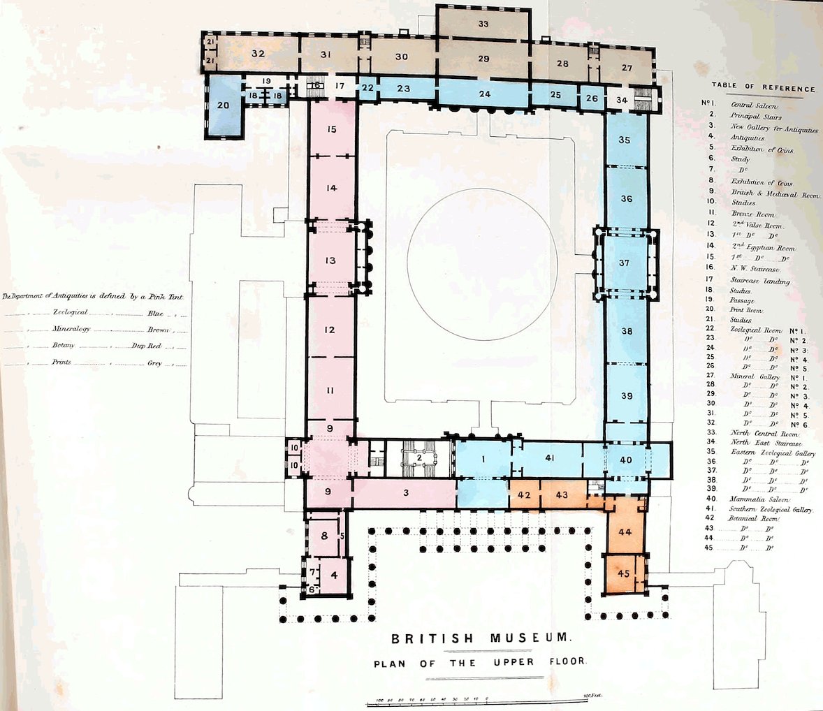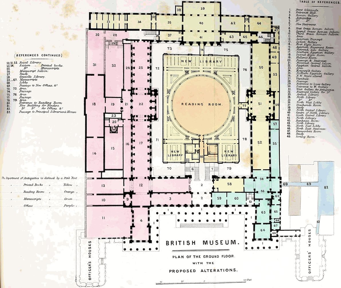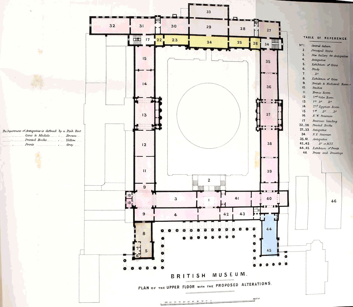 Your Committee are of opinion that the new building facing Montague Street, the building for the bookbinder, the building intended to be erected on the ground now vacant between the Elgin Room and the Print Room, and the construction of the new principal staircases, should be commenced immediately. The building intended to be erected on the vacant ground on the west of the Trustees’ Room (No. 11 on the plan), must, necessarily, be postponed for awhile. The alterations which might and ought to be rapidly completed, are those which will be required on the east side of the King’s Library (No. 55 and 57), to transfer the gallery to the Department of MSS. from that of Printed Books.