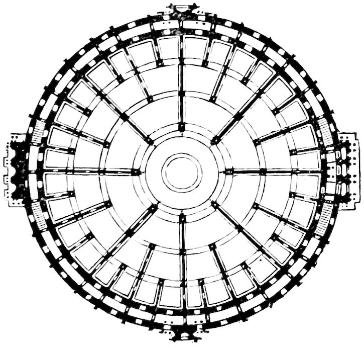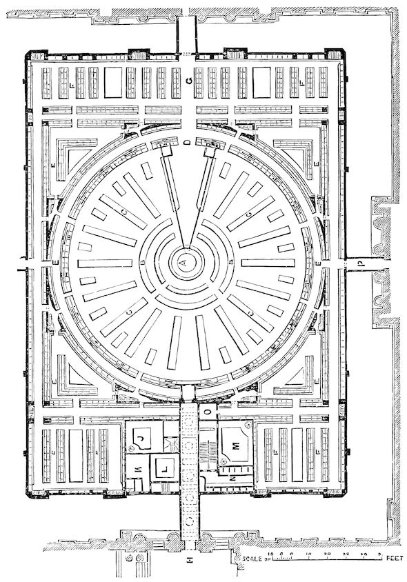 33. If the question of mere hints and analogies in construction were to be followed out to its issues, the result, I feel assured, would in no degree tend to strengthen the contention of Mr. Hosking’s pamphlet. Something like a first germ of the mere ground-plan of the new Reading-Room may, perhaps, be found in M. Benjamin Delessert’s Projet d’une Bibliothèque circulaire, printed, at Paris, as far back as the year 1835, when the question of reconstructing the then ‘Royal,’ now ‘Imperial Library,’ was under discussion in the French Chambers. ‘I propose,’ says Delessert, ‘to place the officers and the readers in the centre of a vast rotunda, whence branch off eight principal galleries, the walls of which form diverging radii ... and have book-cases on both sides,’ &c. His plan may be thus shown, in small. The differences, it will be seen, between this sketch and Mr. Panizzi’s sketch of 1854, are greater than are the resemblances.