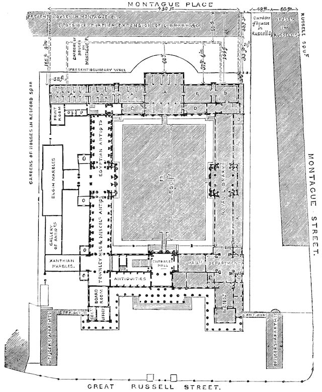 It is, perhaps, unnecessary to do more than simply to remind the Trustees that the want of space at the Museum has been felt and has been urged on the Government for several years past, and that during the last four or five years the additions to the Collections of Antiquities have been so rapid and so numerous, as to render it impossible to do more than provide for them temporary shelter at a considerable expense, and to the great disfigurement of the noble façade which entitles the Museum to claim rank among the most classical buildings of modern times. |Urgency of building at once.| Should the above proposals of your Committee meet with the approbation of the Trustees and the sanction of the Government, they ought to be carried into effect without delay. The Government would, doubtless, lose no time in providing a proper building for the reception of such collections as are to be removed from the Museum; until this removal has taken place, no redistribution of the vacated space can be undertaken; but the new structures proposed to be erected on ground now unoccupied ought to be proceeded with at once, that they might be rendered available as speedily as possible.