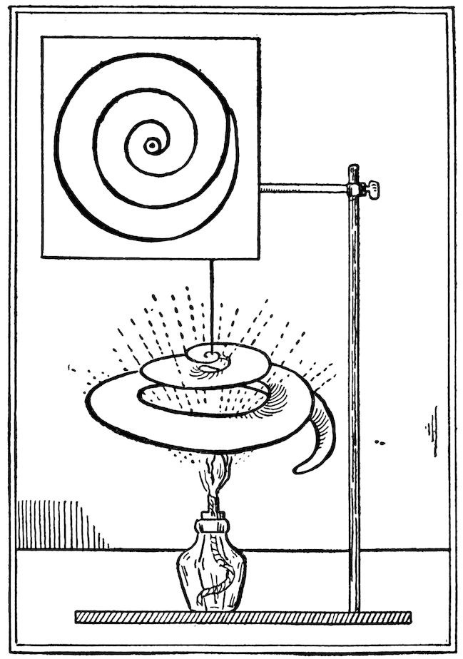 Cut a piece of stiff cardboard in a spiral shape. Thread a piece of thread through a pinhole in the center point of the spiral and 12fasten this to a support so that it swings freely in the air. (See Fig. 8.) Under this put a little alcohol lamp, or put it over a gas jet or radiator.