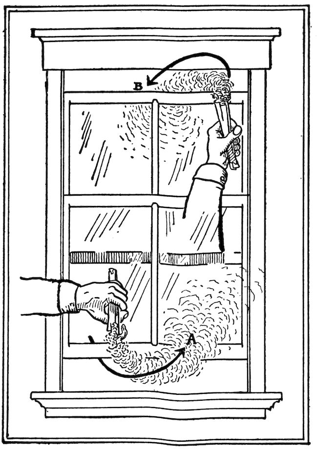 Another experiment that is quite familiar to all of us is that of opening the windows of a heated room a few inches top and bottom, and holding a lighted match or smoke paper at the bottom, when you will find that it blows the flame or smoke inward. Then put it near the top of the window and it will be drawn out. The same answer is true; the cold air is rushing in 13from below to take the place of the hot air rising and going out at the top. (See Fig. 9.)