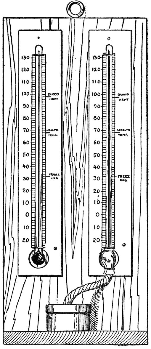 The state of the air with respect to the vapor that it contains is called its humidity. The humidity is said to be high when the air is damp, and low when the air is dry. Humidity and moisture in the air are important factors about the weather. It is lack of humidity that has more to do with poor health, colds, and catarrh than anything else. The importance of proper humidity in houses and buildings cannot be emphasized too greatly. Proper humidity will save twelve and one-half per cent in the cost of heating. The great majority of people are under the impression that colds are caused by sudden change in temperature, but the most colds are actually caused by stuffy, hot rooms. The reason that some people complain that 70° is not hot enough is because the humidity is too low, but if the moisture is brought into the air at a proper degree, the humidity is maintained. You will find that 68° will be a proper temperature to maintain in a room. The reason for this is that the air in the room is dry and the heat actually goes through it. In other words, it does not warm it; moist air stops radiation. Consequently, the result is that it warms it. In other words, moisture is nothing more than clothing, and this accounts for the fact that in a hot room, where there is no moisture, we heat our rooms beyond the degree that is necessary in order to feel any reasonable amount of comfort. Dry air allows too much radiation from the body and too rapid evaporation, which makes us cold.