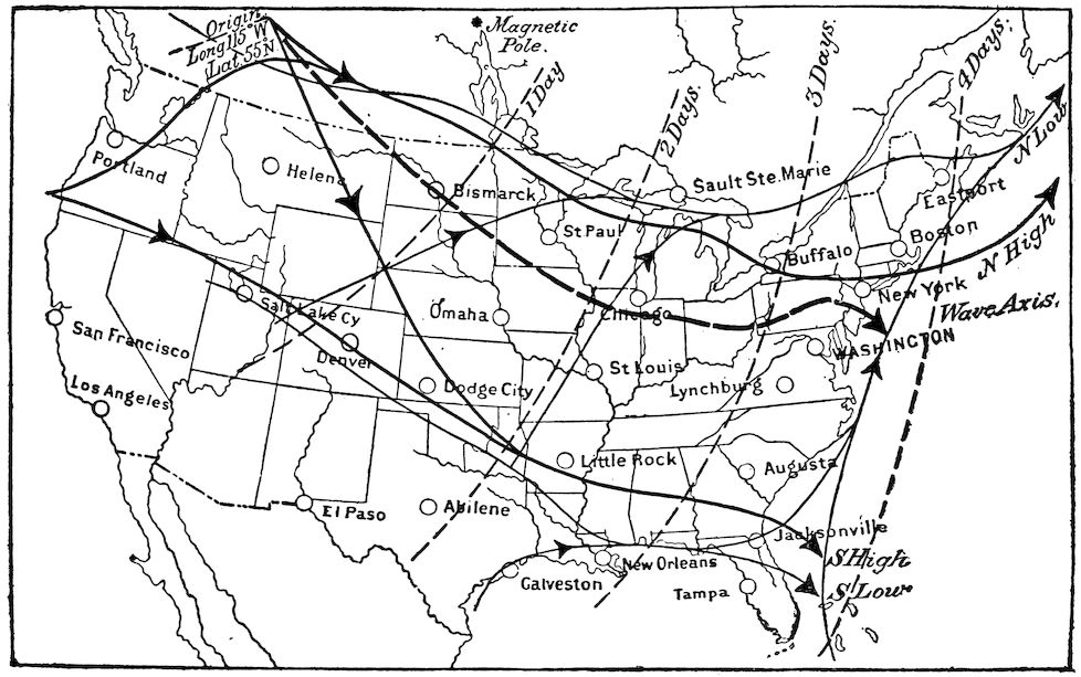 The United States Weather Bureau has made a very intensive study of the positions of the tracks of the storms. Fig. 55 shows the mean tracks and the movement of storms from day to day. This map indicates that generally there are two sets of lines running west and east, one set over the northwestern boundary, the Lake region, and the St. Lawrence Valley, the other set over the middle Rocky Mountain districts and the Gulf States. Each of these is double, with one for the “highs” and one for the “lows.” Furthermore, there are lines crossing from the main tracks to join them together, showing how storms pass from one to the other. On the chart, the heavy lines all belong to the tracks of the “highs,” and the lighter lines to the track of the “lows.”