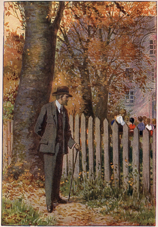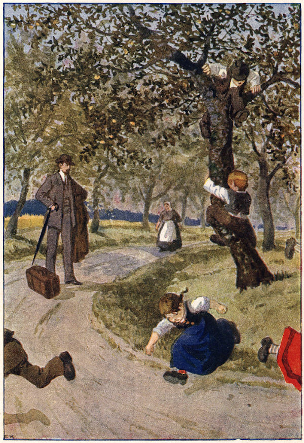 Aus dem Graben schauten drei lachende kleine Mädel heraus, und oben auf dem Baume kreischte Arne laut vor Vergnügen. Sein Jubel fand ein Echo. Plötzlich lachte, schrie und kicherte es die ganze Apfelstraße entlang. Den Buben und Mädeln schien die[22] Purzelei des Fremden ein lustiger Spaß zu sein, dieser selbst freilich fand es gar nicht lustig, der war sehr verdrießlich. Er suchte mißmutig seine Sachen zusammen, die zerstreut am Boden lagen, und dachte dabei: »Das ist ja ein netter Anfang! Wenn das so weiter geht, wird es mir schwerlich gut in Steinach gefallen.«