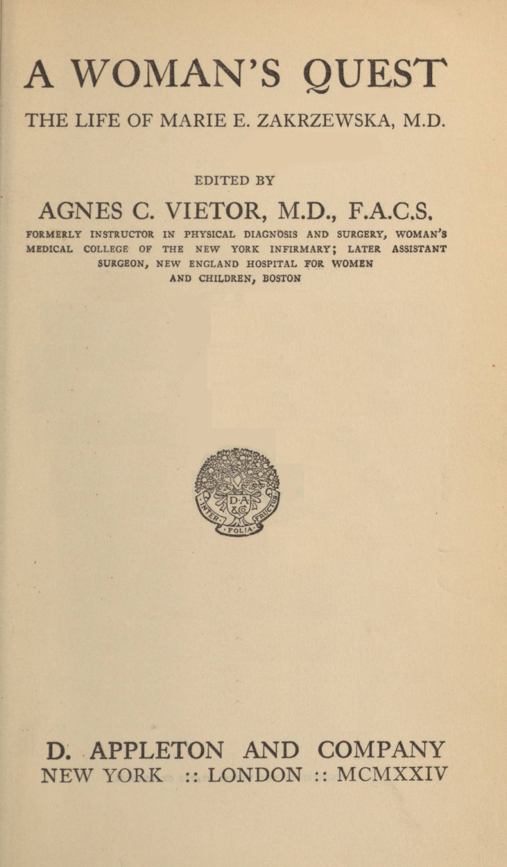 Viewed impersonally, this story of Marie E. Zakrzewska (Zak-shef’ska) is one more document testifying to the Humanity of Woman. The fact that the individual urge for the expression of this humanity found vent along the line of Medicine, is a detail. It is also a detail that the story is interwoven with an interesting transitional period in American history and with the evolution of the American woman physician.
