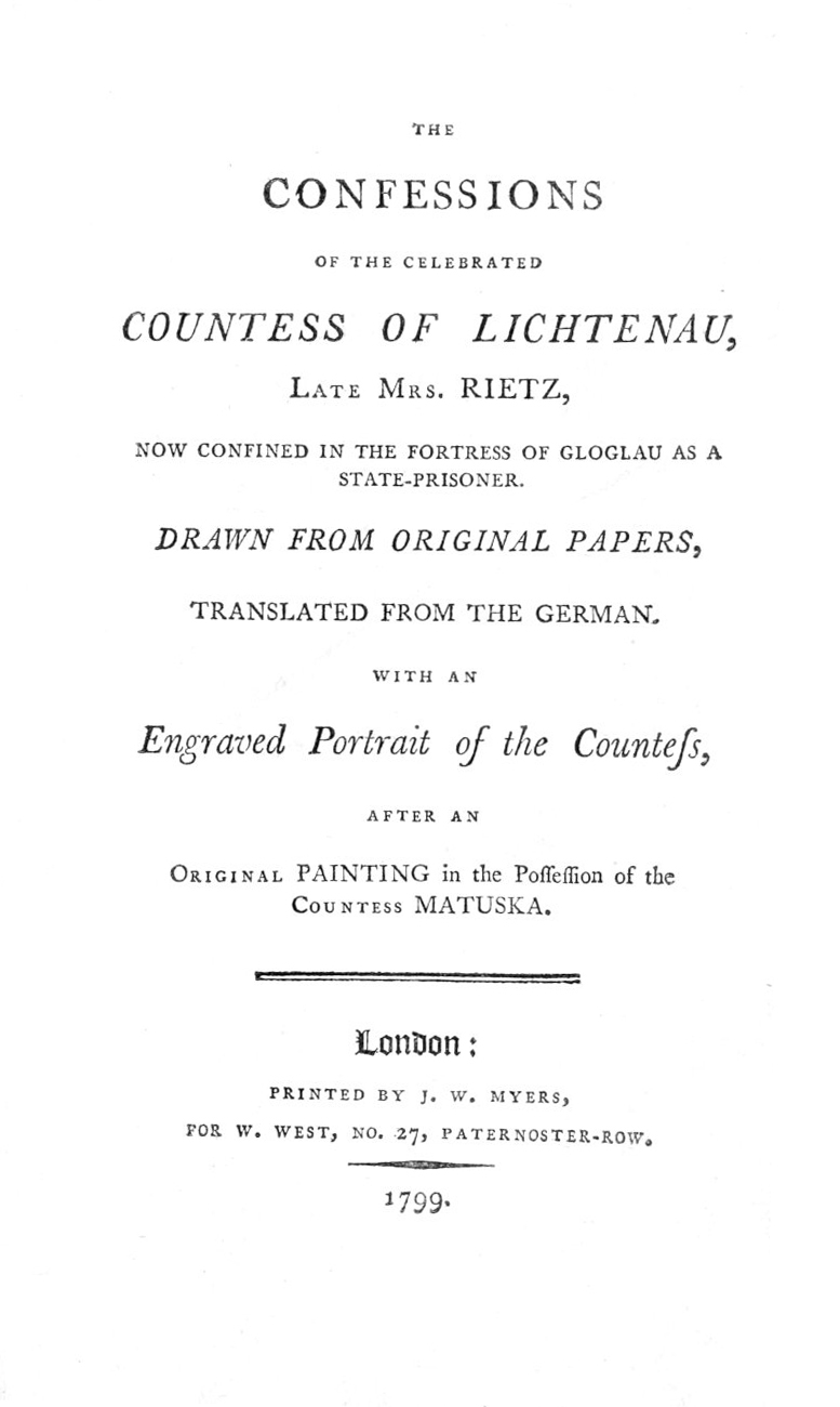 Title: The Confessions of the Celebrated Countess of Lichtenau, late Mrs. Rietz, now Confined in the Fortress of Gloglau as a State-prisoner