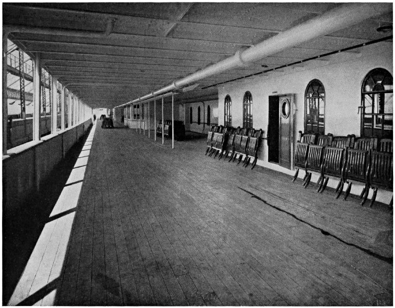 Removing my night clothing I dressed myself hurriedly in underclothing, shoes and stockings, trousers and a Norfolk coat. I give these details in order that some idea of the lapse of time may be formed by an account of what I did during the interval. From my cabin, through the corridor to the stairway was but a short distance, and I ascended to the third deck above, that is, to the Boat Deck. I found here only one young lad, seemingly bent on the same quest as myself.