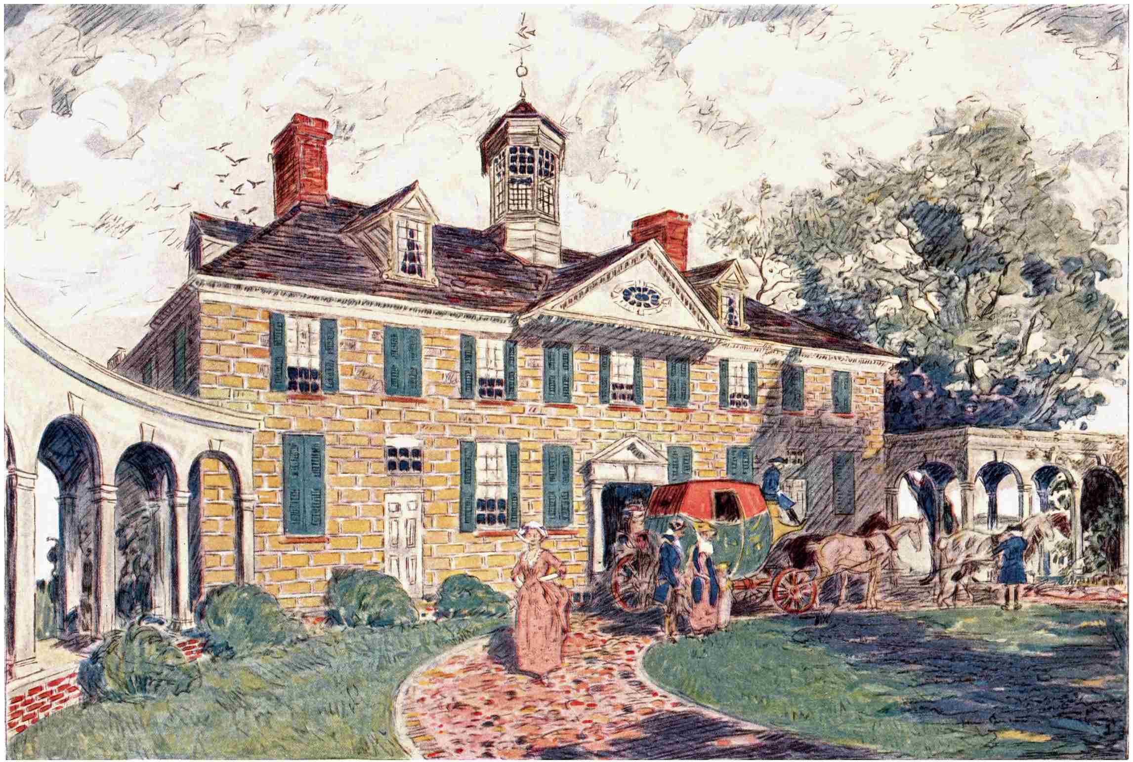 While we were fighting to preserve the heritage and the traditions left us by Washington, Jefferson, Carroll of Carrollton, and other great figures of their time, whom we find in these pages, we were too busily engaged to give much thought to the origins of the things we fought to save. Not that the forefathers of the nation were forgotten, but that historic men were, in that time of stress, overshadowed by historic principles laid down by them. We put them aside tenderly, as books are put aside when the sword is taken up. Yet now that we have vindicated in battle the freedom that they gave us, we find them more than ever with us. For a just war fought through to victory sheds glory not only upon the men who fought it and the nation for which they fought, but also upon the nation’s ancient heroes, whose stature is increased with that of their country. Wherefore this book, telling tales of old houses in which early American history was made, and of10 men who made the houses and the history, is even more welcome today than it would have been before the Great War.